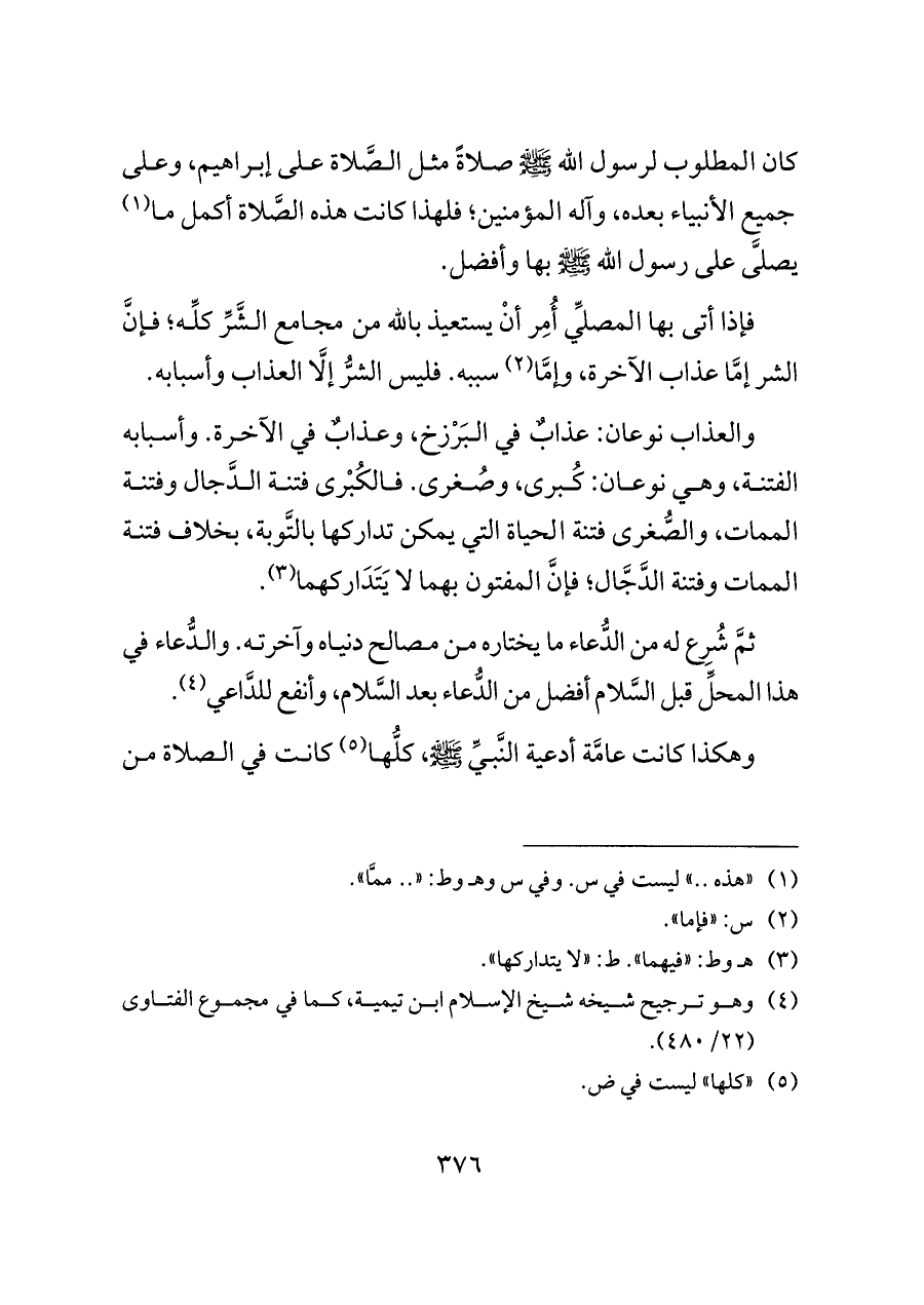 كان المطلوب لرسول الله - صلى الله عليه وسلم - صلاةً مثل الصَّلاة على إبراهيم، وعلى جميع الأنبياء بعده، وآله المؤمنين؛ فلهذا كانت هذه الصَّلاة أكمل ما (¬١) يصلَّى على رسول الله - صلى الله عليه وسلم - بها وأفضل.
