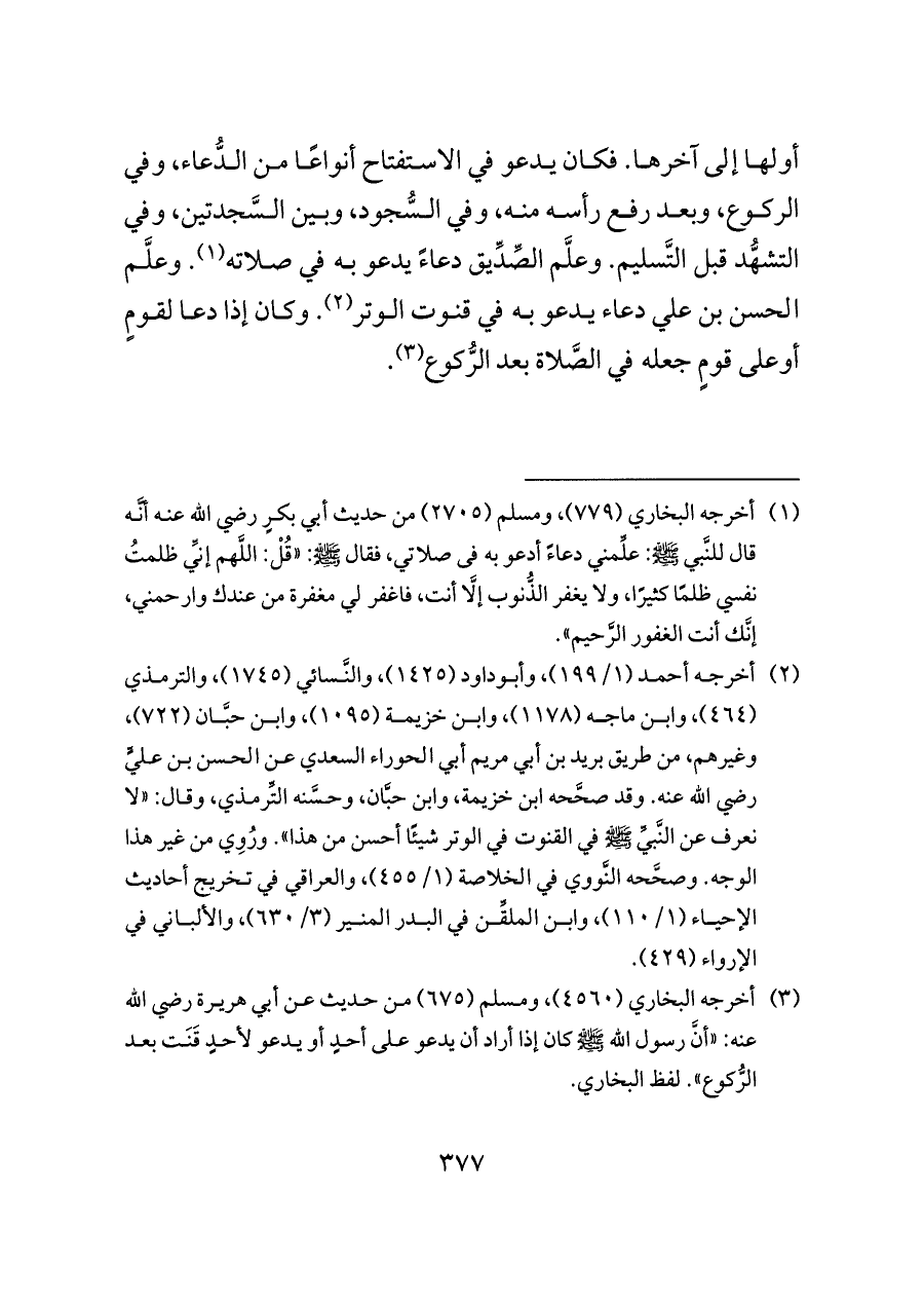 (¬٢) أخرجه أحمد (١/ ١٩٩)، وأبوداود (١٤٢٥)، والنَّسائي (١٧٤٥)، والترمذي (٤٦٤)، وابن ماجه (١١٧٨)، وابن خزيمة (١٠٩٥)، وابن حبَّان (٧٢٢)، وغيرهم، من طريق بريد بن أبي مريم أبي الحوراء السعدي عن الحسن بن عليٍّ رضي الله عنه. وقد صحَّحه ابن خزيمة، وابن حبَّان، وحسَّنه التِّرمذي، وقال: «لا نعرف عن النَّبيِّ - صلى الله عليه وسلم - في القنوت في الوتر شيئًا أحسن من هذا». ورُوِي من غير هذا الوجه. وصحَّحه النَّووي في الخلاصة (١/ ٤٥٥)، والعراقي في تخريج أحاديث الإحياء (١/ ١١٠)، وابن الملقِّن في البدر المنير (٣/ ٦٣٠)، والألباني في الإرواء (٤٢٩).