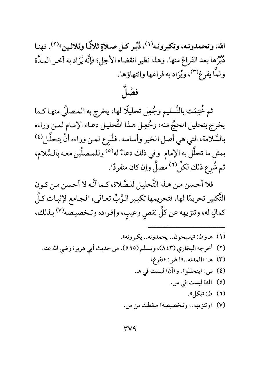 فلا أحسن من هذا التَّحليل للصَّلاة، كما أنَّه لا أحسن من كون التَّكبير تحريمًا لها. فتحريمها تكبير الرَّبِّ تعالى، الجامع لإثبات كلِّ كمالٍ له، وتنزيهه عن كلِّ نقصٍ وعيبٍ، وإفراده وتخصيصه (¬٧) بذلك،