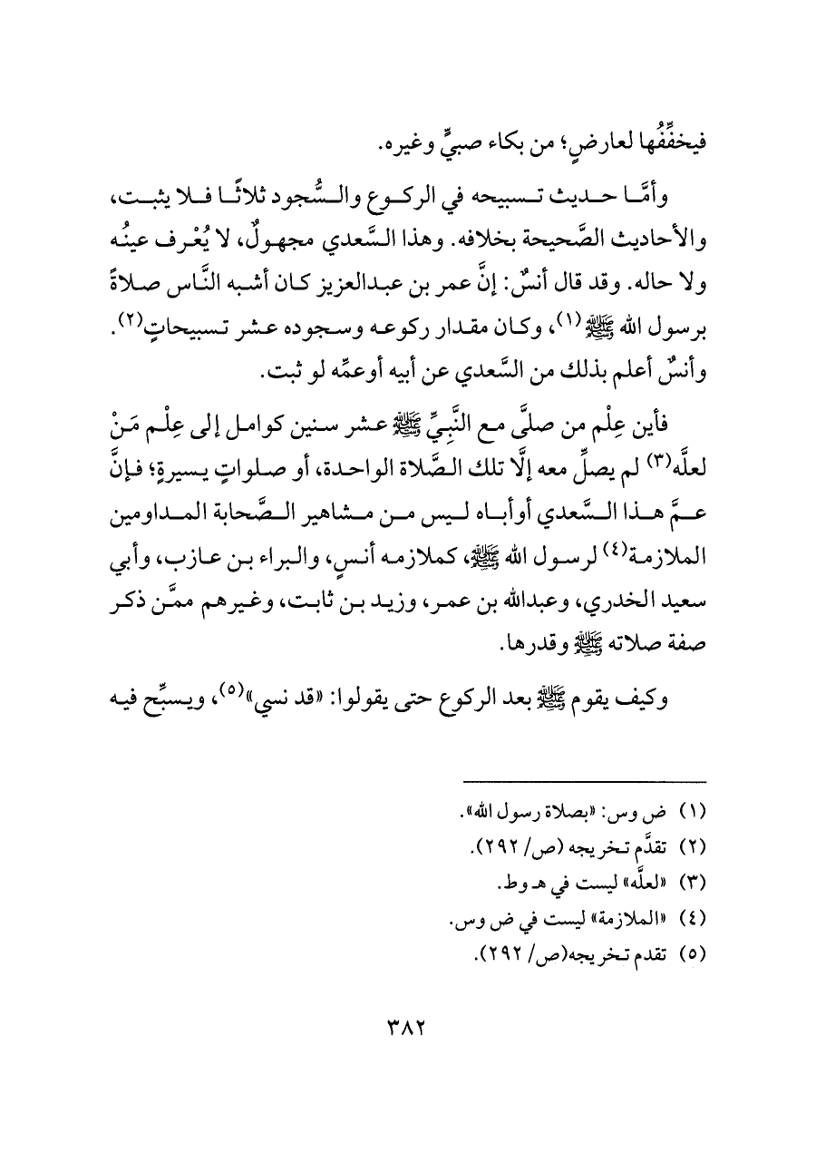 وأمَّا حديث تسبيحه في الركوع والسُّجود ثلاثًا فلا يثبت، والأحاديث الصَّحيحة بخلافه. وهذا السَّعدي مجهولٌ، لا يُعْرف عينُه ولا حاله. وقد قال أنسٌ: إنَّ عمر بن عبدالعزيز كان أشبه النَّاس صلاةً برسول الله - صلى الله عليه وسلم - (¬١)، وكان مقدار ركوعه وسجوده عشر تسبيحاتٍ (¬٢). وأنسٌ أعلم بذلك من السَّعدي عن أبيه أوعمِّه لو ثبت.