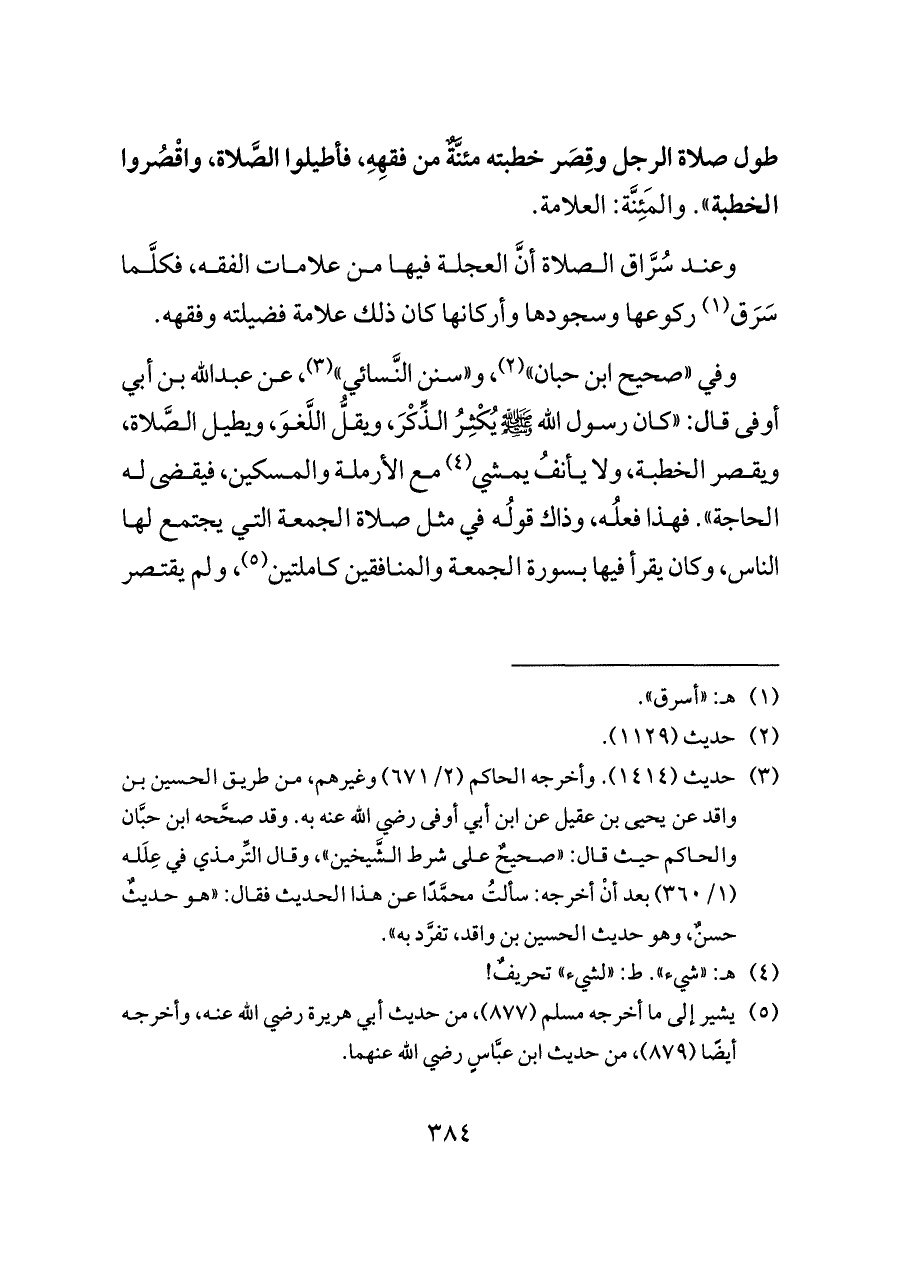 وفي «صحيح ابن حبان» (¬٢)، و «سنن النَّسائي» (¬٣)، عن عبدالله بن أبي أوفى قال: «كان رسول الله - صلى الله عليه وسلم - يُكْثِرُ الذِّكْرَ، ويقلُّ اللَّغوَ، ويطيل الصَّلاة، ويقصر الخطبة، ولا يأنفُ يمشي (¬٤) مع الأرملة والمسكين، فيقضى له الحاجة». فهذا فعلُه، وذاك قولُه في مثل صلاة الجمعة التي يجتمع لها الناس، وكان يقرأ فيها بسورة الجمعة والمنافقين كاملتين (¬٥)، ولم يقتصر
