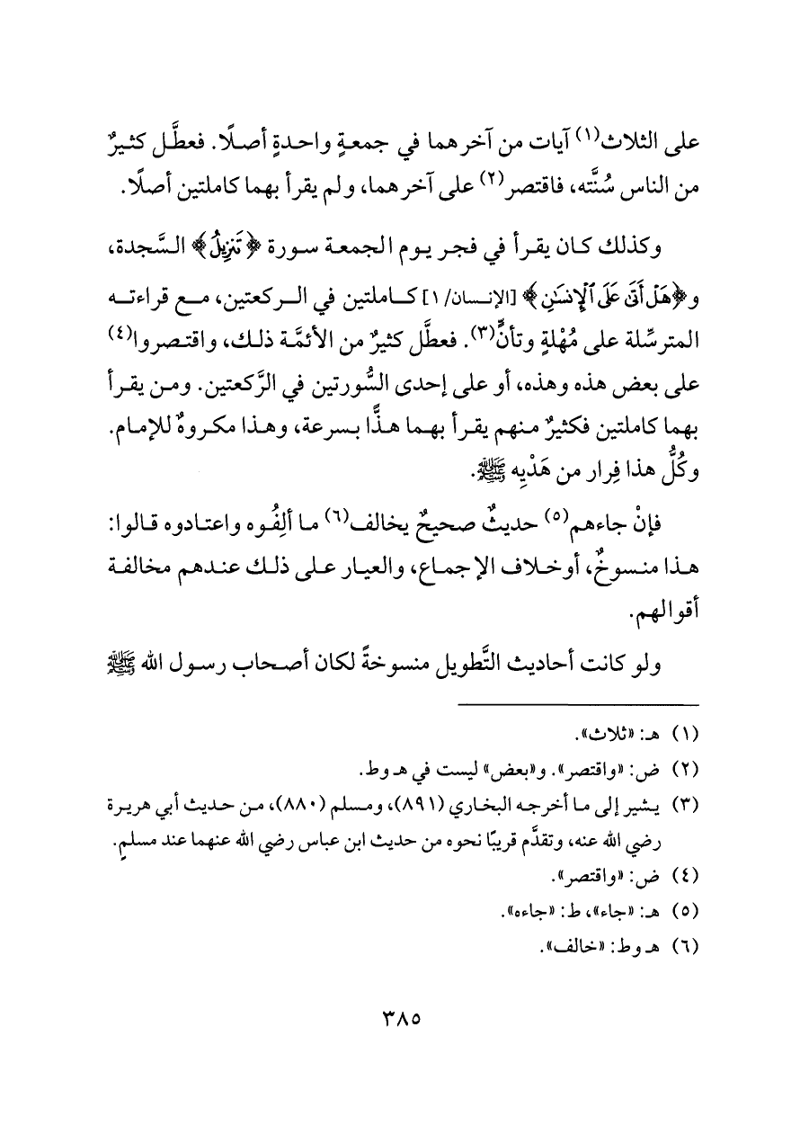 وكذلك كان يقرأ في فجر يوم الجمعة سورة {تَنْزِيلُ} السَّجدة، و {هَلْ أَتَى عَلَى الْإِنْسَانِ} [الإنسان/١] كاملتين في الركعتين، مع قراءته المترسِّلة على مُهْلةٍ وتأنٍّ (¬٣). فعطَّل كثيرٌ من الأئمَّة ذلك، واقتصروا (¬٤) على بعض هذه وهذه، أو على إحدى السُّورتين في الرَّكعتين. ومن يقرأ بهما كاملتين فكثيرٌ منهم يقرأ بهما هذًّا بسرعة، وهذا مكروهٌ للإمام. وكُلُّ هذا فِرار من هَدْيِه - صلى الله عليه وسلم -.