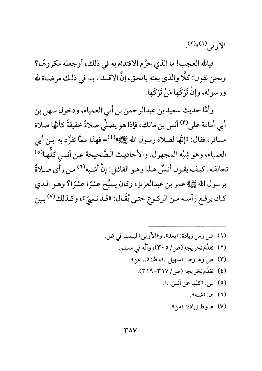 وأمَّا حديث سعيد بن عبدالرحمن بن أبي العمياء، ودخول سهل بن أبي أمامة على (¬٣) أنس بن مالك، فإذا هو يصلِّي صلاةً خفيفةً كأنَّها صلاة مسافر، فقال: «إنَّها لصلاة رسول الله - صلى الله عليه وسلم -» (¬٤) = فهذا ممَّا تفرَّد به ابن أبي العمياء، وهو شِبْه المجهول. والأحاديث الصَّحيحة عن أنسٍ كلُّها (¬٥) تخالفه. كيف يقول أنسٌ هذا وهو القائل: إنَّ أشبه (¬٦) من رأى صلاةً برسول الله - صلى الله عليه وسلم - عمر بن عبدالعزيز، وكان يسبِّح عشرًا عشرًا؟ وهو الذي كان يرفع رأسه من الركوع حتى يُقَال: «قد نسِيَ»، وكذلك (¬٧) بين