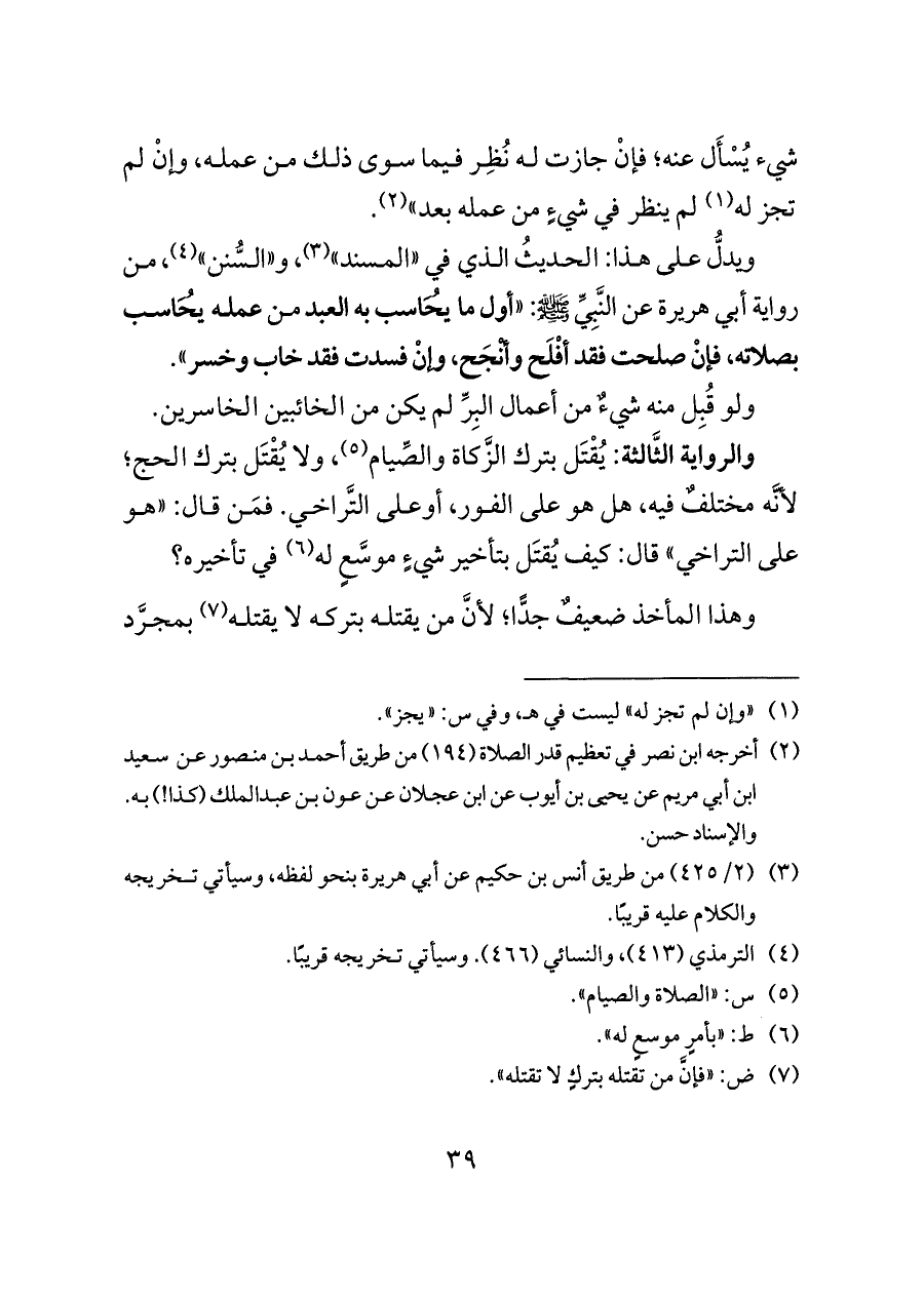 ويدلُّ على هذا: الحديثُ الذي في "المسند" (¬٣)، و"السُّنن" (¬٤)، من رواية أبي هريرة عن النَّبِيِّ - صلى الله عليه وسلم -: "أول ما يُحَاسب به العبد من عمله يُحَاسب بصلاته، فإنْ صلحت فقد أفْلَح وأنْجَح، وإنْ فسدت فقد خاب وخسر".