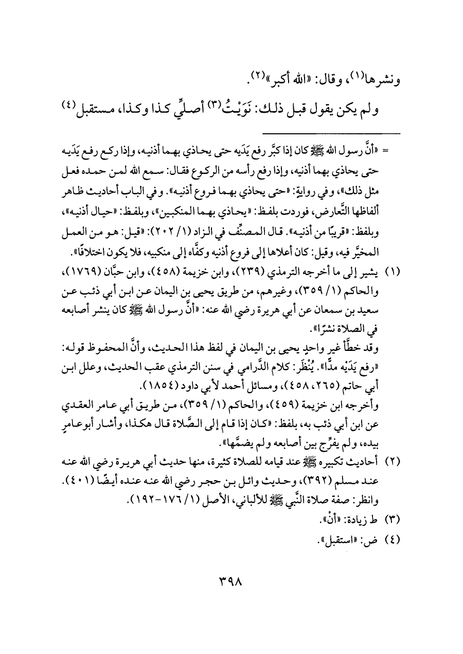 (¬٢) أحاديث تكبيره - صلى الله عليه وسلم - عند قيامه للصلاة كثيرة، منها حديث أبي هريرة رضي الله عنه عند مسلم (٣٩٢)، وحديث وائل بن حجر رضي الله عنه عنده أيضًا (٤٠١). وانظر: صفة صلاة النَّبي - صلى الله عليه وسلم - للألباني، الأصل (١/ ١٧٦ - ١٩٢).
