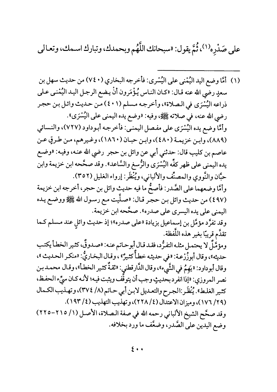 وقد تفرَّد مؤمَّل بن إسماعيل بزيادة «على صدره»؛ إذ حديث وائلٍ عند مسلم كما تقدَّم قريبًا بغير هذه اللَّفظة.