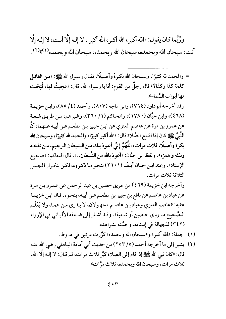 (¬٢) يشير إلى ما أخرجه أحمد (٥/ ٢٥٣) من حديث أبي أمامة الباهلي رضي الله عنه قال: «كان نبي الله - صلى الله عليه وسلم - إذا قام إلى الصلاة كبَّر ثلاث مرات، ثم قال: لا إله إلَّا الله، ثلاث مرات، وسبحان الله وبحمده، ثلاث مرَّات».