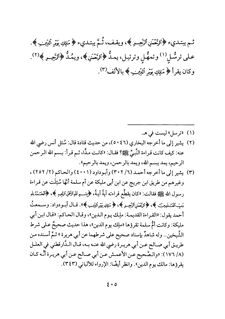 (¬٢) يشير إلى ما أخرجه البخاري (٥٠٤٦)، من حديث قتادة قال: سُئل أنس رضي الله عنه: كيف كانت قراءة النَّبيِّ - صلى الله عليه وسلم -؟ فقال: «كانت مدًّا، ثم قرأ: بسم الله الرحمن الرحيم، يمد ببسم الله، ويمد بالرحمن، ويمد بالرحيم».