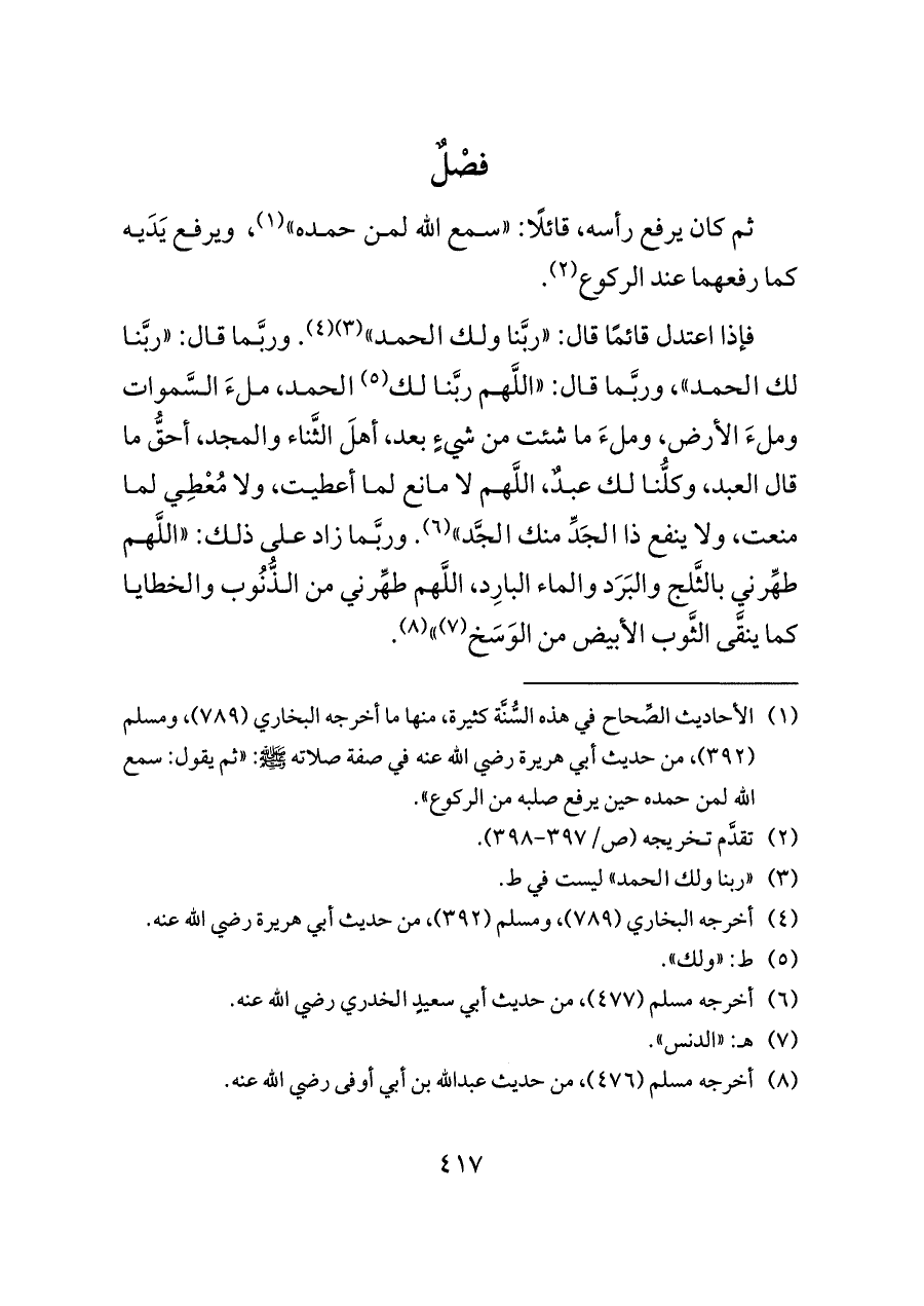 فإذا اعتدل قائمًا قال: «ربَّنا ولك الحمد» (¬٣) (¬٤). وربَّما قال: «ربَّنا لك الحمد»، وربَّما قال: «اللَّهم ربَّنا لك (¬٥) الحمد، ملءَ السَّموات وملءَ الأرض، وملءَ ما شئت من شيءٍ بعد، أهلَ الثَّناء والمجد، أحقُّ ما قال العبد، وكلُّنا لك عبدٌ، اللَّهم لا مانع لما أعطيت، ولا مُعْطِي لما منعت، ولا ينفع ذا الجَدِّ منك الجَّد» (¬٦). وربَّما زاد على ذلك: «اللَّهم طهِّرني بالثَّلج والبَرَد والماء البارِد، اللَّهم طهِّرني من الذُّنُوب والخطايا كما ينقَّى الثَّوب الأبيض من الوَسَخ (¬٧)» (¬٨).
