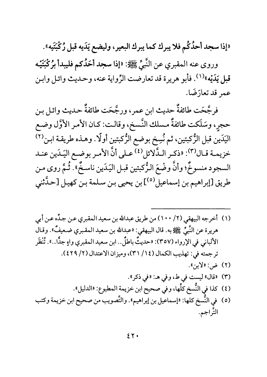فرجَّحَت طائفةٌ حديث ابن عمر، ورجَّحَت طائفةٌ حديث وائل بن حجرٍ، وسَلَكت طائفةٌ مسلك النَّسخ، وقالت: كان الأمر الأوَّل وضع اليَدَين قبل الرُّكبتين، ثم نُسِخ بوضع الرُّكبتين أولًا. وهذه طريقة ابن (¬٢) خزيمة قال (¬٣): «ذكر الدَّلائل (¬٤) على أنَّ الأمر بوضع اليَدَين عند السجود منسوخٌ؛ وأنَّ وضْعَ الرُّكبتين قبل اليَدَين ناسخٌ». ثُمَّ روى من طريق [إبراهيم بن إسماعيل (¬٥)] بن يحيى بن سلمة بن كهيل [حدَّثني