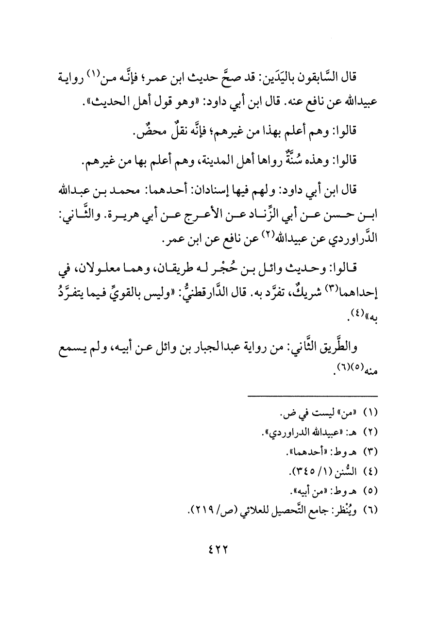 قال السَّابقون باليَدَين: قد صحَّ حديث ابن عمر؛ فإنَّه من (¬١) رواية عبيدالله عن نافع عنه. قال ابن أبي داود: «وهو قول أهل الحديث».