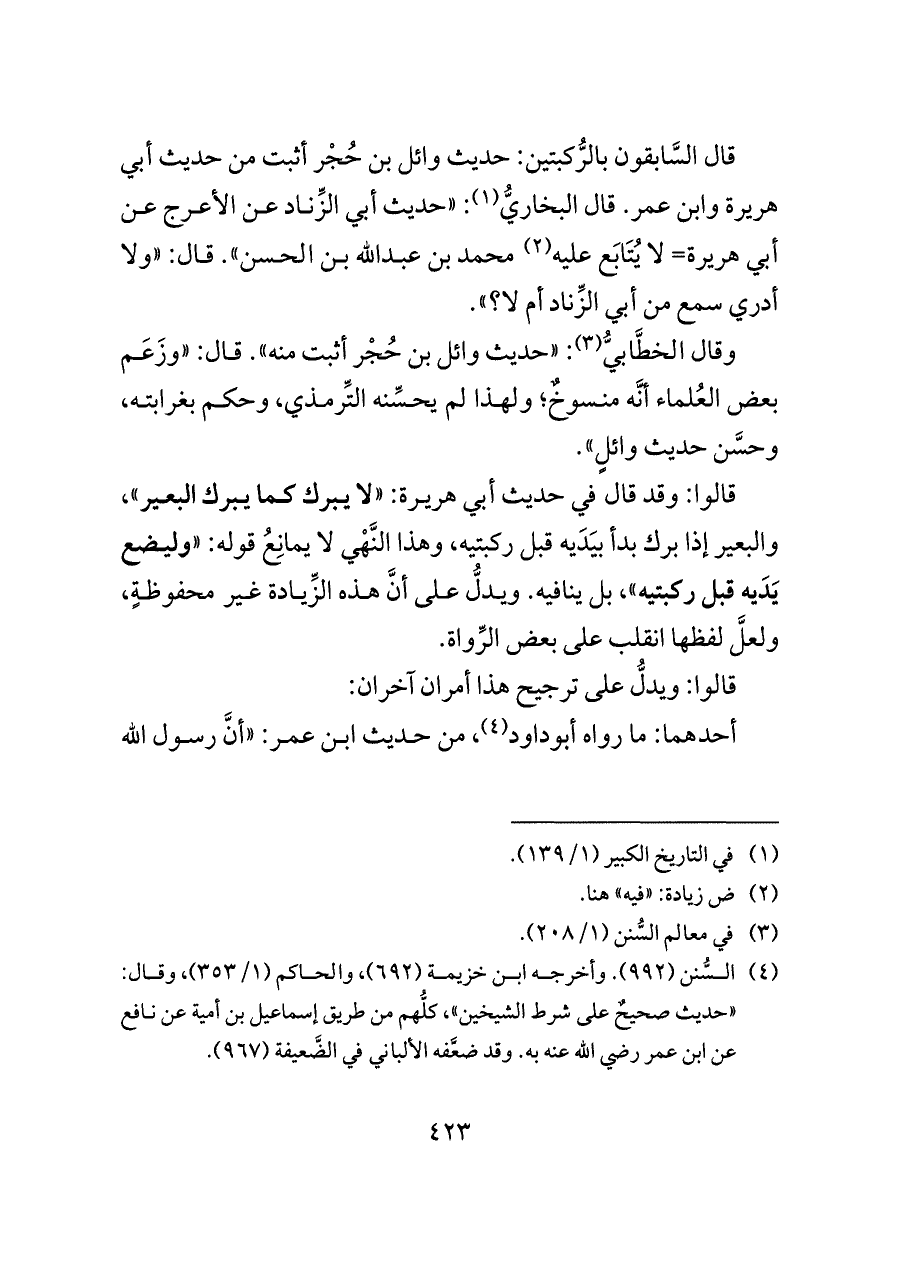 قال السَّابقون بالرُّكبتين: حديث وائل بن حُجْر أثبت من حديث أبي هريرة وابن عمر. قال البخاريُّ (¬١): «حديث أبي الزِّناد عن الأعرج عن أبي هريرة= لا يُتَابَع عليه (¬٢) محمد بن عبدالله بن الحسن». قال: «ولا أدري سمع من أبي الزِّناد أم لا؟».