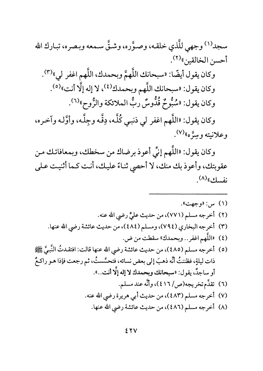(¬٥) أخرجه مسلم (٤٨٥)، من حديث عائشة رضي الله عنها قالت: افتقدتُ النَّبيَّ - صلى الله عليه وسلم - ذات ليلةٍ، فظننتُ أنَّه ذهبَ إلى بعض نسائه، فتحسَّستُ، ثم رجعت فإذا هو راكعٌ أو ساجدٌ، يقول: «سبحانك وبحمدك لا إله إلَّا أنت .. ».