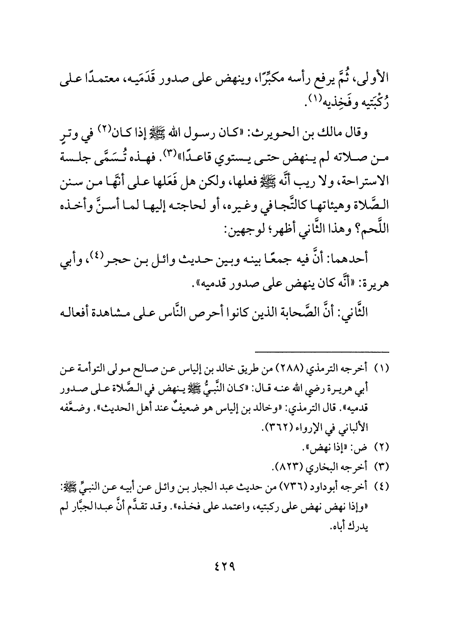 (¬١) أخرجه الترمذي (٢٨٨) من طريق خالد بن إلياس عن صالح مولى التوأمة عن أبي هريرة رضي الله عنه قال: «كان النَّبيُّ - صلى الله عليه وسلم - ينهض في الصَّلاة على صدور قدميه». قال الترمذي: «وخالد بن إلياس هو ضعيفٌ عند أهل الحديث». وضعَّفه الألباني في الإرواء (٣٦٢).