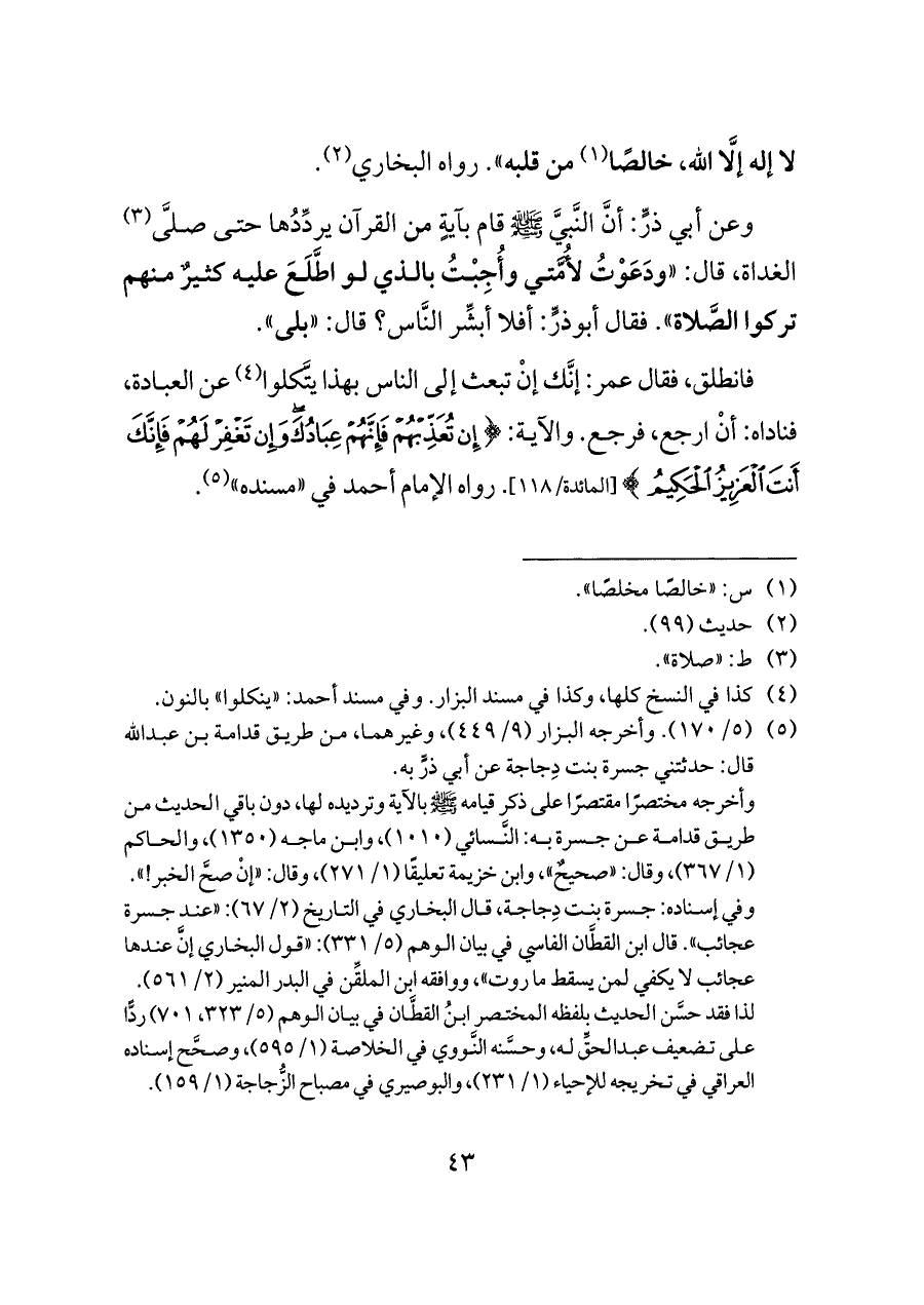 فانطلق، فقال عمر: إنَّك إنْ تبعث إلى الناس بهذا يتَّكلوا (¬٤) عن العبادة، فناداه: أنْ ارجع، فرجع. والآية: {إِنْ تُعَذِّبْهُمْ فَإِنَّهُمْ عِبَادُكَ وَإِنْ تَغْفِرْ لَهُمْ فَإِنَّكَ أَنْتَ الْعَزِيزُ الْحَكِيمُ} [المائدة/١١٨]. رواه الإمام أحمد في "مسنده" (¬٥).