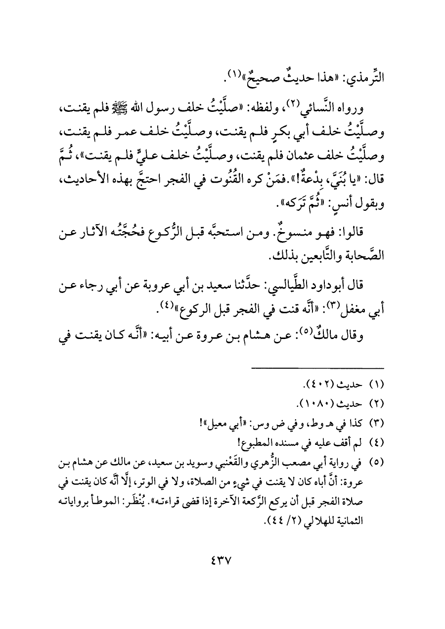 ورواه النَّسائي (¬٢)، ولفظه: «صلَّيْتُ خلف رسول الله - صلى الله عليه وسلم - فلم يقنت، وصلَّيْتُ خلف أبي بكرٍ فلم يقنت، وصلَّيْتُ خلف عمر فلم يقنت، وصلَّيْتُ خلف عثمان فلم يقنت، وصلَّيْتُ خلف عليٍّ فلم يقنت»، ثُمَّ قال: «يا بُنَيَّ، بِدْعةٌ!».فمَنْ كره القُنُوت في الفجر احتجَّ بهذه الأحاديث، وبقول أنسٍ: «ثُمَّ تَرَكه».