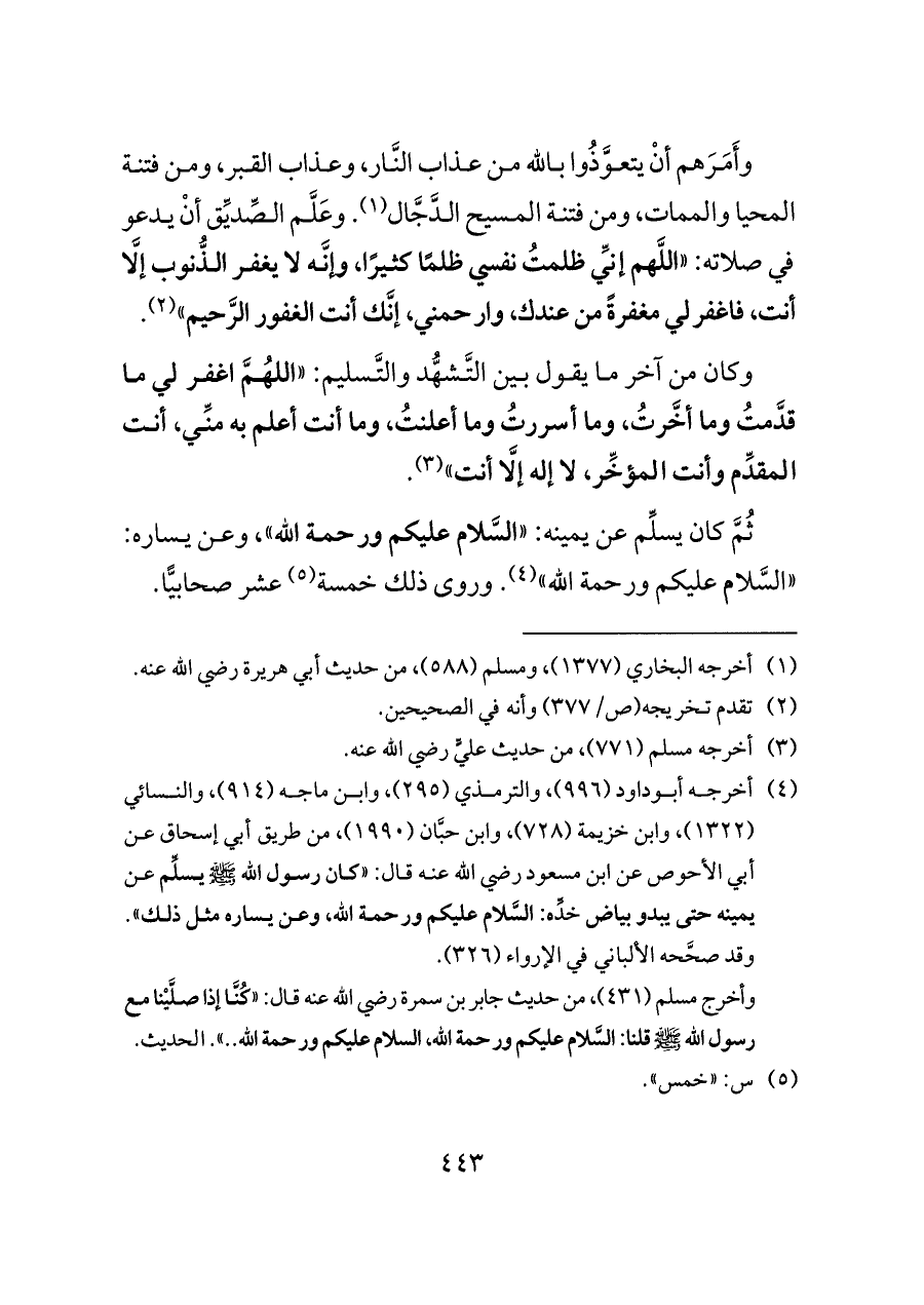 وأَمَرَهم أنْ يتعوَّذُوا بالله من عذاب النَّار، وعذاب القبر، ومن فتنة المحيا والممات، ومن فتنة المسيح الدَّجَّال (¬١). وعَلَّم الصِّديِّق أنْ يدعو في صلاته: «اللَّهم إنِّي ظلمتُ نفسي ظلمًا كثيرًا، وإنَّه لا يغفر الذُّنوب إلَّا أنت، فاغفرلي مغفرةً من عندك، وارحمني، إنَّك أنت الغفور الرَّحيم» (¬٢).