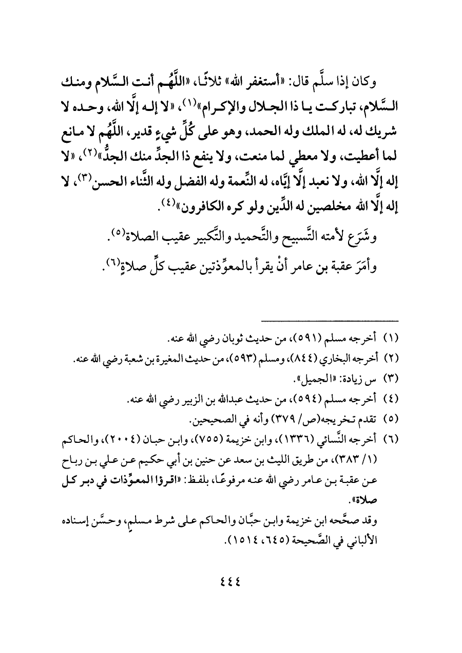(¬٦) أخرجه النَّسائي (١٣٣٦)، وابن خزيمة (٧٥٥)، وابن حبان (٢٠٠٤)، والحاكم (١/ ٣٨٣)، من طريق الليث بن سعد عن حنين بن أبي حكيم عن علي بن رباح عن عقبة بن عامر رضي الله عنه مرفوعًا، بلفظ: «اقرؤا المعوِّذات في دبر كل صلاة».