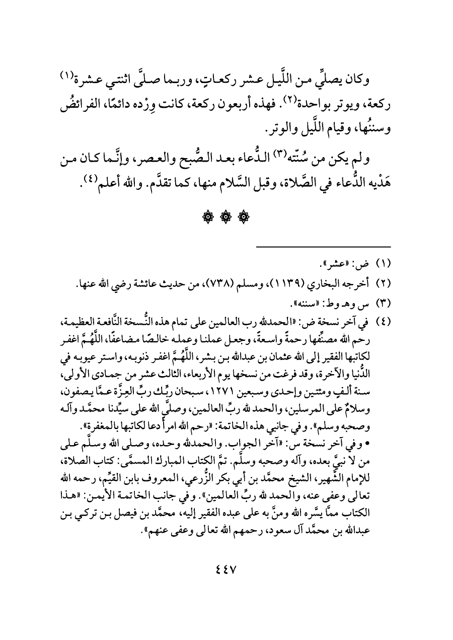 (¬٤) في آخر نسخة ض: «الحمدلله رب العالمين على تمام هذه النُّسخة النَّافعة العظيمة، رحم الله مصنِّفها رحمةً واسعةً، وجعل عملنا وعمله خالصًا مضاعفًا، اللَّهُمَّ اغفر لكاتبها الفقير إلى الله عثمان بن عبدالله بن بشر، اللَّهُمَّ اغفر ذنوبه، واستر عيوبه في الدُّنيا والآخرة، وقد فرغت من نسخها يوم الأربعاء، الثالث عشر من جمادى الأولى، سنة ألفٍ ومئتين وإحدى وسبعين ١٢٧١، سبحان ربِّك ربِّ العِزَّة عمَّا يصفون، وسلامٌ على المرسلين، والحمد لله ربِّ العالمين، وصلَّى الله على سيِّدنا محمَّد وآله وصحبه وسلم». وفي جانبي هذه الخاتمة: «رحم الله امرأً دعا لكاتبها بالمغفرة».