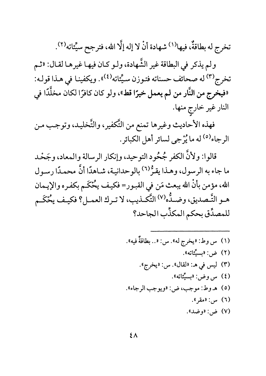 ولم يذكر في البطاقة غير الشَّهادة، ولو كان فيها غيرها لقال: "ثم تخرج (¬٣) له صحائف حسناته فتوزن سيِّئاته (¬٤) ". ويكفينا في هذا قوله: "فيخرج من النَّار من لم يعمل خيرًا قط"، ولو كان كافرًا لكان مخلَّدًا في النار غير خارجٍ منها.