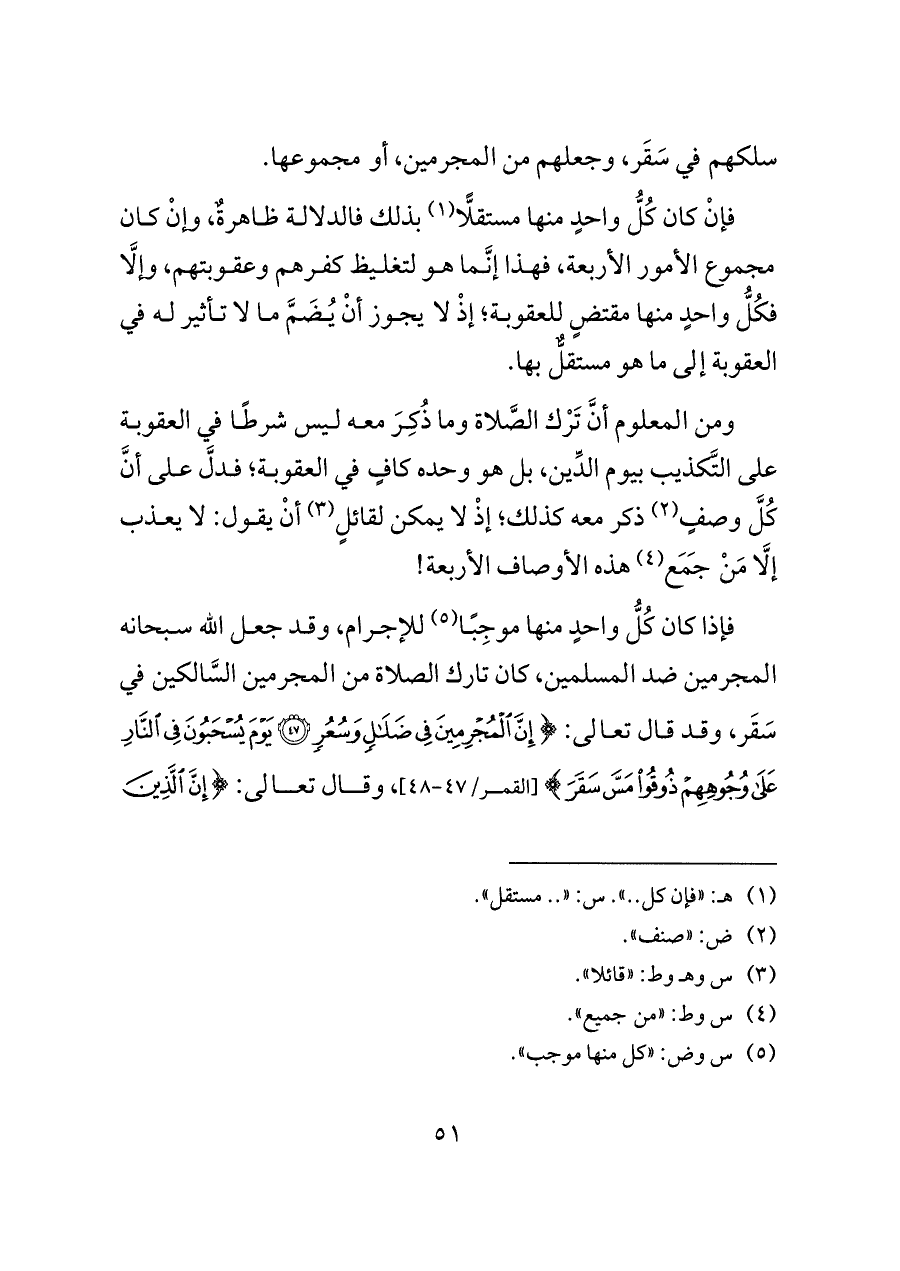 فإذا كان كُلُّ واحدٍ منها موجِبًا (¬٥) للإجرام، وقد جعل الله سبحانه المجرمين ضد المسلمين، كان تارك الصلاة من المجرمين السَّالكين في سَقَر، وقد قال تعالى: {إِنَّ الْمُجْرِمِينَ فِي ضَلَالٍ وَسُعُرٍ (٤٧) يَوْمَ يُسْحَبُونَ فِي النَّارِ عَلَى وُجُوهِهِمْ ذُوقُوا مَسَّ سَقَرَ} [القمر/٤٧ - ٤٨]، وقال تعالى: {إِنَّ الَّذِينَ