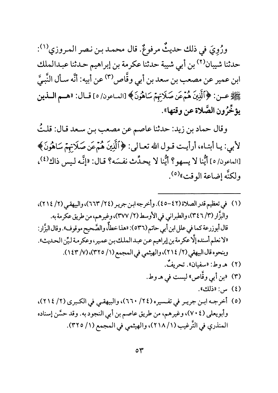 حدثنا شيبان (¬٢) بن أبي شيبة حدثنا عكرمة بن إبراهيم حدثنا عبدالملك ابن عمير عن مصعب بن سعد بن أبي وقَّاص (¬٣) عن أبيه: أنَّه سأل النَّبيَّ - صلى الله عليه وسلم - عن: {الَّذِينَ هُمْ عَنْ صَلَاتِهِمْ سَاهُونَ} [الماعون/٥] قال: "هم الذين يؤخِّرُون الصَّلاة عن وقتها".