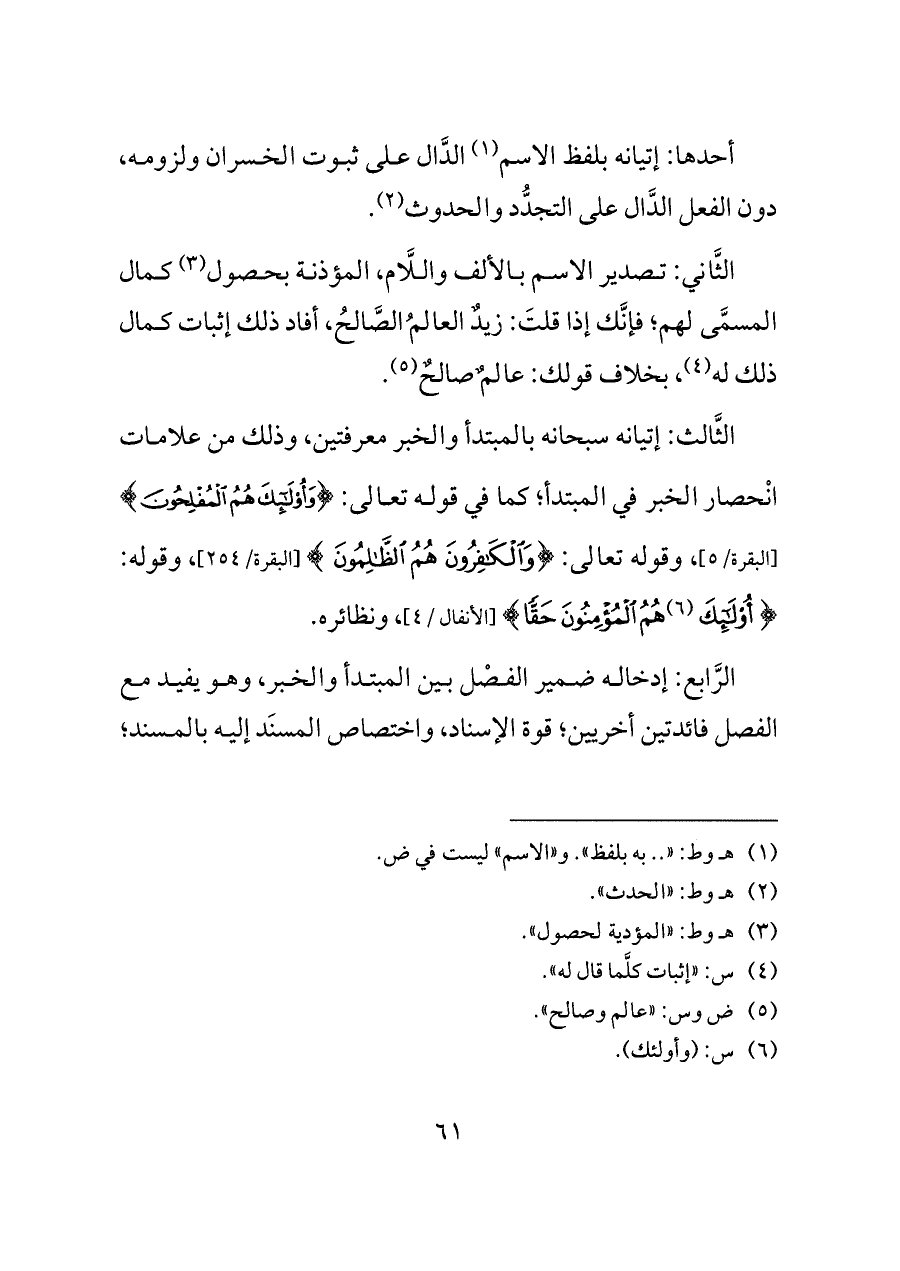 الرَّابع: إدخاله ضمير الفصْل بين المبتدأ والخبر، وهو يفيد مع الفصل فائدتين أخريين؛ قوة الإسناد، واختصاص المسنَد إليه بالمسند؛