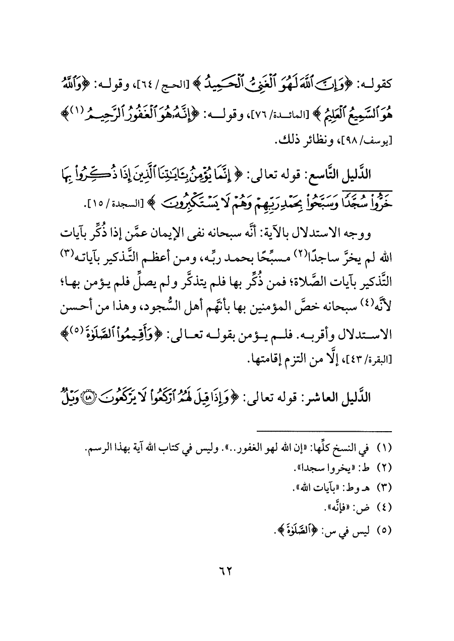 ووجه الاستدلال بالآية: أنَّه سبحانه نفى الإيمان عمَّن إذا ذُكِّر بآيات الله لم يخرَّ ساجدًا (¬٢) مسبِّحًا بحمد ربِّه، ومن أعظم التَّذكير بآياته (¬٣) التَّذكير بآيات الصَّلاة؛ فمن ذُكِّر بها فلم يتذكَّر ولم يصلِّ فلم يؤمن بها؛ لأنَّه (¬٤) سبحانه خصَّ المؤمنين بها بأنَّهم أهل السُّجود، وهذا من أحسن الاستدلال وأقربه. فلم يؤمن بقوله تعالى: {وَأَقِيمُوا الصَّلَاةَ (¬٥)} [البقرة/٤٣]، إلَّا من التزم إقامتها.