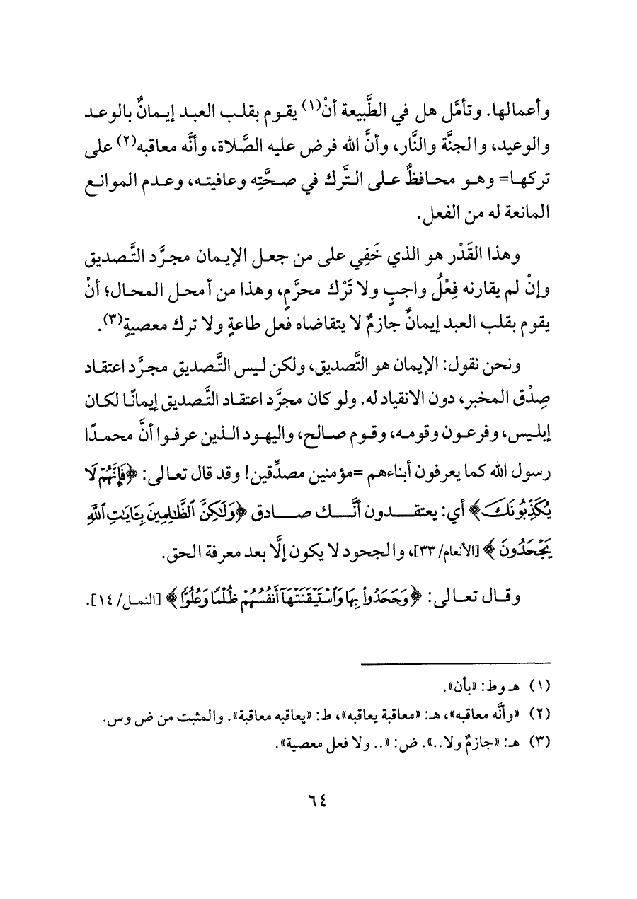 ونحن نقول: الإيمان هو التَّصديق، ولكن ليس التَّصديق مجرَّد اعتقاد صِدْق المخبر، دون الانقياد له. ولو كان مجرَّد اعتقاد التَّصديق إيمانًا لكان إبليس، وفرعون وقومه، وقوم صالح، واليهود الذين عرفوا أنَّ محمدًا رسول الله كما يعرفون أبناءهم =مؤمنين مصدِّقين! وقد قال تعالى: {فَإِنَّهُمْ لَا يُكَذِّبُونَكَ} أي: يعتقدون أنَّك صادق {وَلَكِنَّ الظَّالِمِينَ بِآيَاتِ اللَّهِ يَجْحَدُونَ} [الأنعام/٣٣]، والجحود لا يكون إلَّا بعد معرفة الحق.