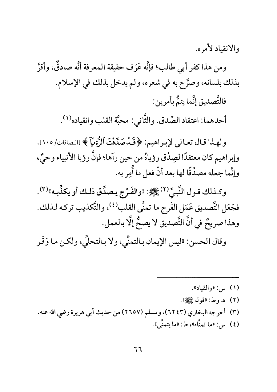 ومن هذا كفر أبي طالب؛ فإنَّه عَرَف حقيقة المعرفة أنَّه صادقٌ، وأقرَّ بذلك بلسانه، وصرَّح به في شعره، ولم يدخل بذلك في الإسلام.