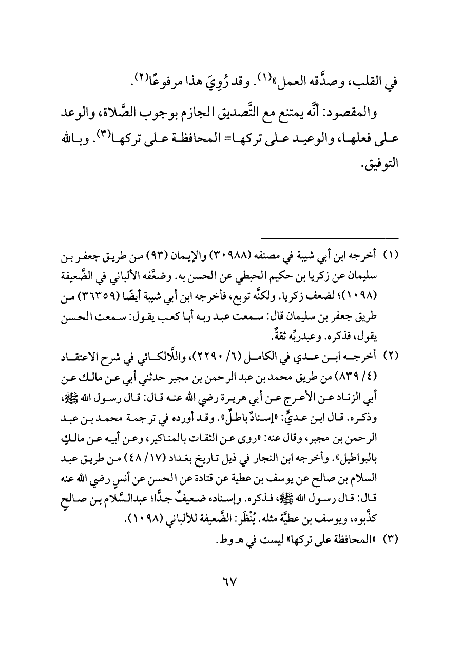 (¬١) أخرجه ابن أبي شيبة في مصنفه (٣٠٩٨٨) والإيمان (٩٣) من طريق جعفر بن سليمان عن زكريا بن حكيم الحبطي عن الحسن به. وضعَّفه الألباني في الضَّعيفة (١٠٩٨)؛ لضعف زكريا. ولكنَّه توبع، فأخرجه ابن أبي شيبة أيضًا (٣٦٣٥٩) من طريق جعفر بن سليمان قال: سمعت عبد ربه أبا كعب يقول: سمعت الحسن يقول، فذكره. وعبدربِّه ثقةٌ.