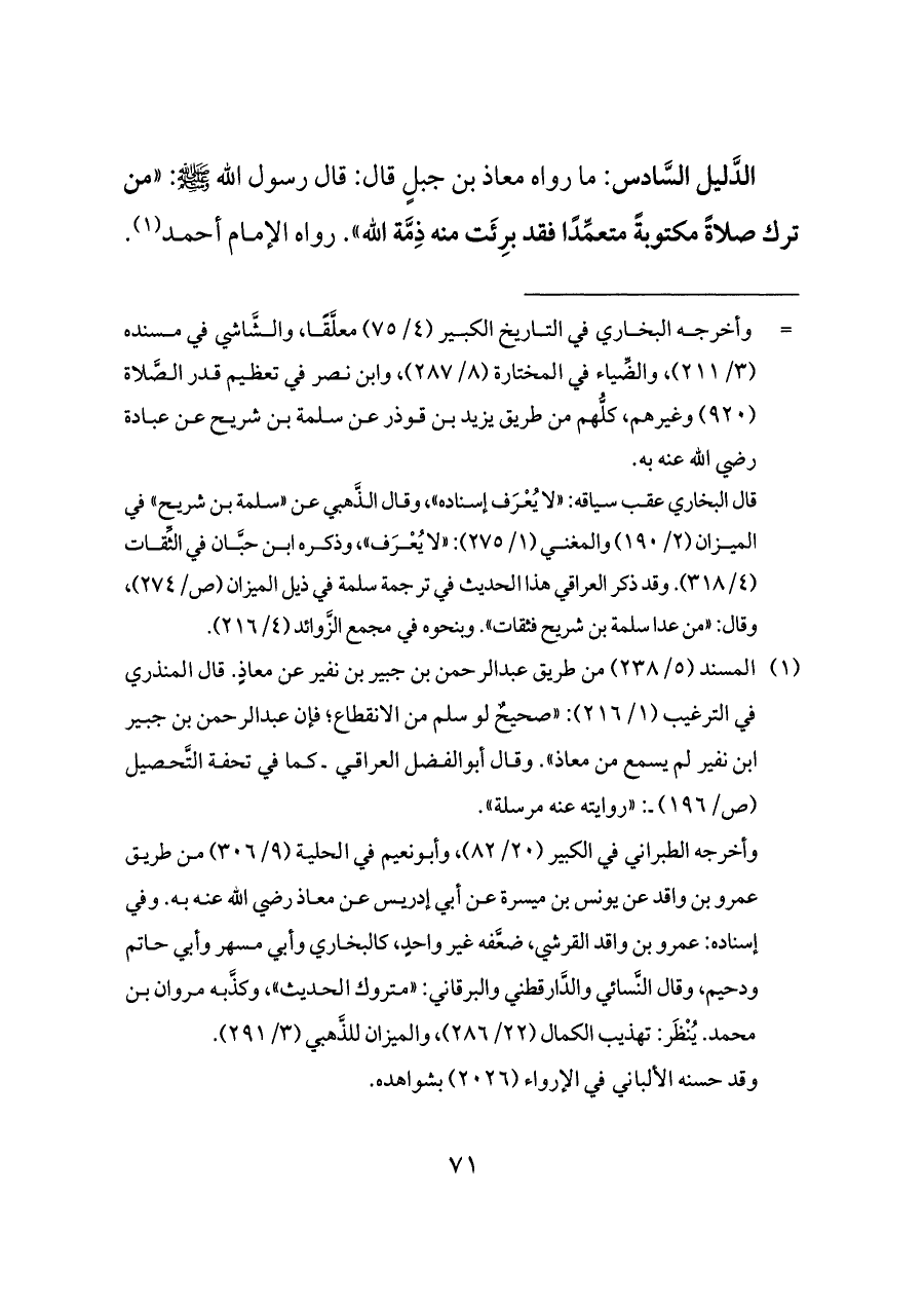 الدَّليل السَّادس: ما رواه معاذ بن جبلٍ قال: قال رسول الله - صلى الله عليه وسلم -: "من ترك صلاةً مكتوبةً متعمِّدًا فقد برِئَت منه ذِمَّة الله". رواه الإمام أحمد (¬١).