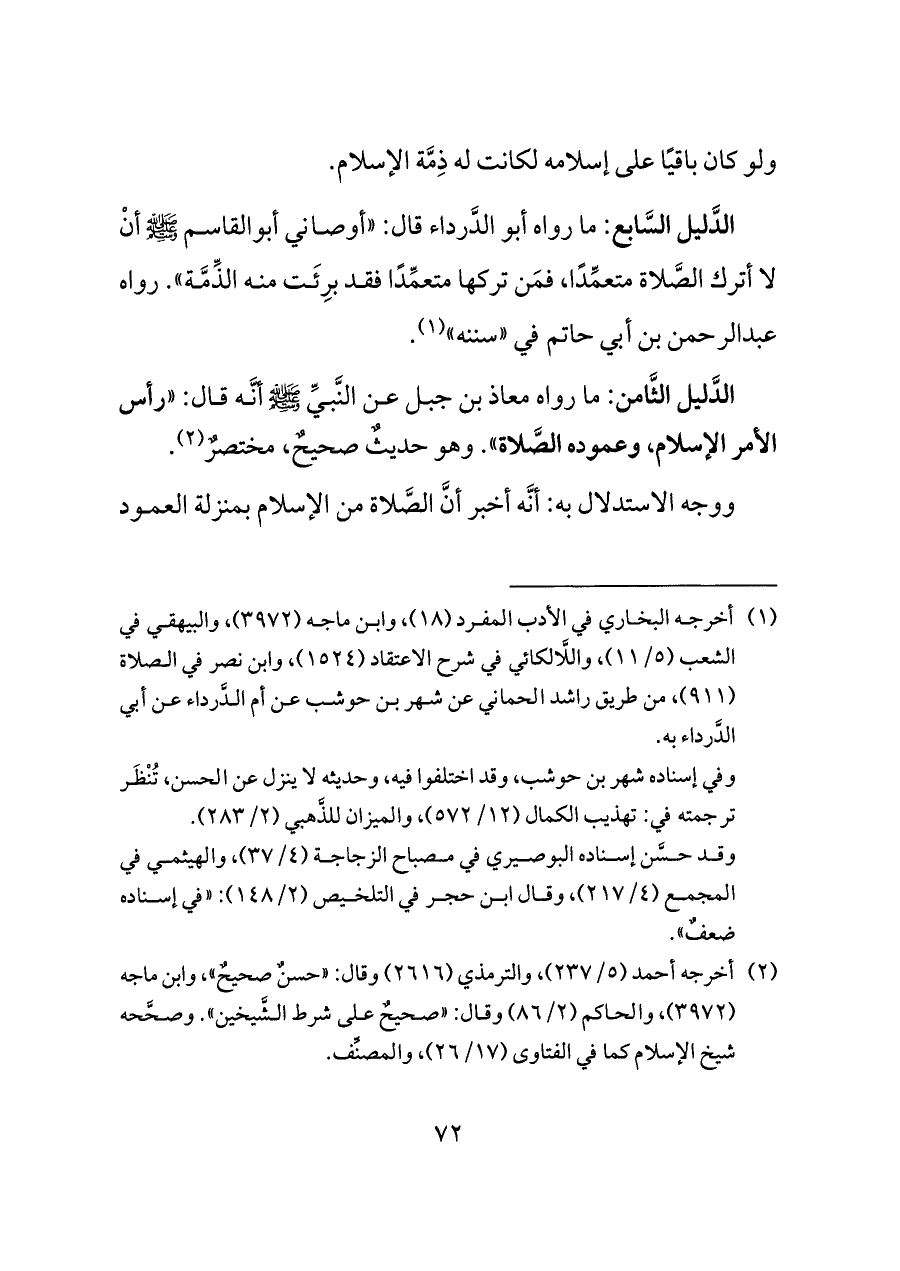 الدَّليل السَّابع: ما رواه أبو الدَّرداء قال: "أوصاني أبوالقاسم - صلى الله عليه وسلم - أنْ لا أترك الصَّلاة متعمِّدًا، فمَن تركها متعمِّدًا فقد برِئَت منه الذِّمَّة". رواه عبدالرحمن بن أبي حاتم في "سننه" (¬١).
