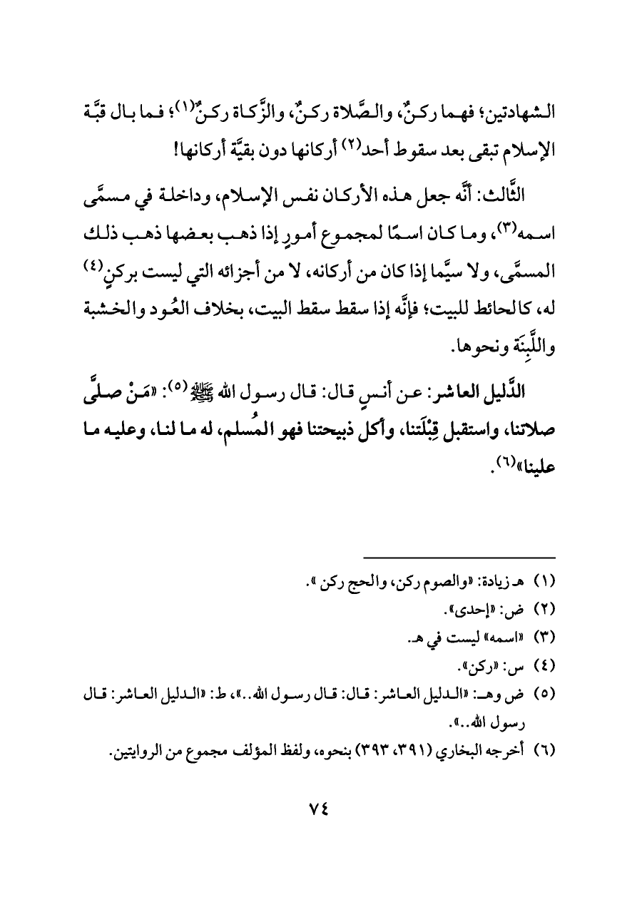 الدَّليل العاشر: عن أنسٍ قال: قال رسول الله - صلى الله عليه وسلم - (¬٥): "مَنْ صلَّى صلاتنا، واستقبل قِبْلَتنا، وأكل ذبيحتنا فهو المُسلم، له ما لنا، وعليه ما علينا" (¬٦).