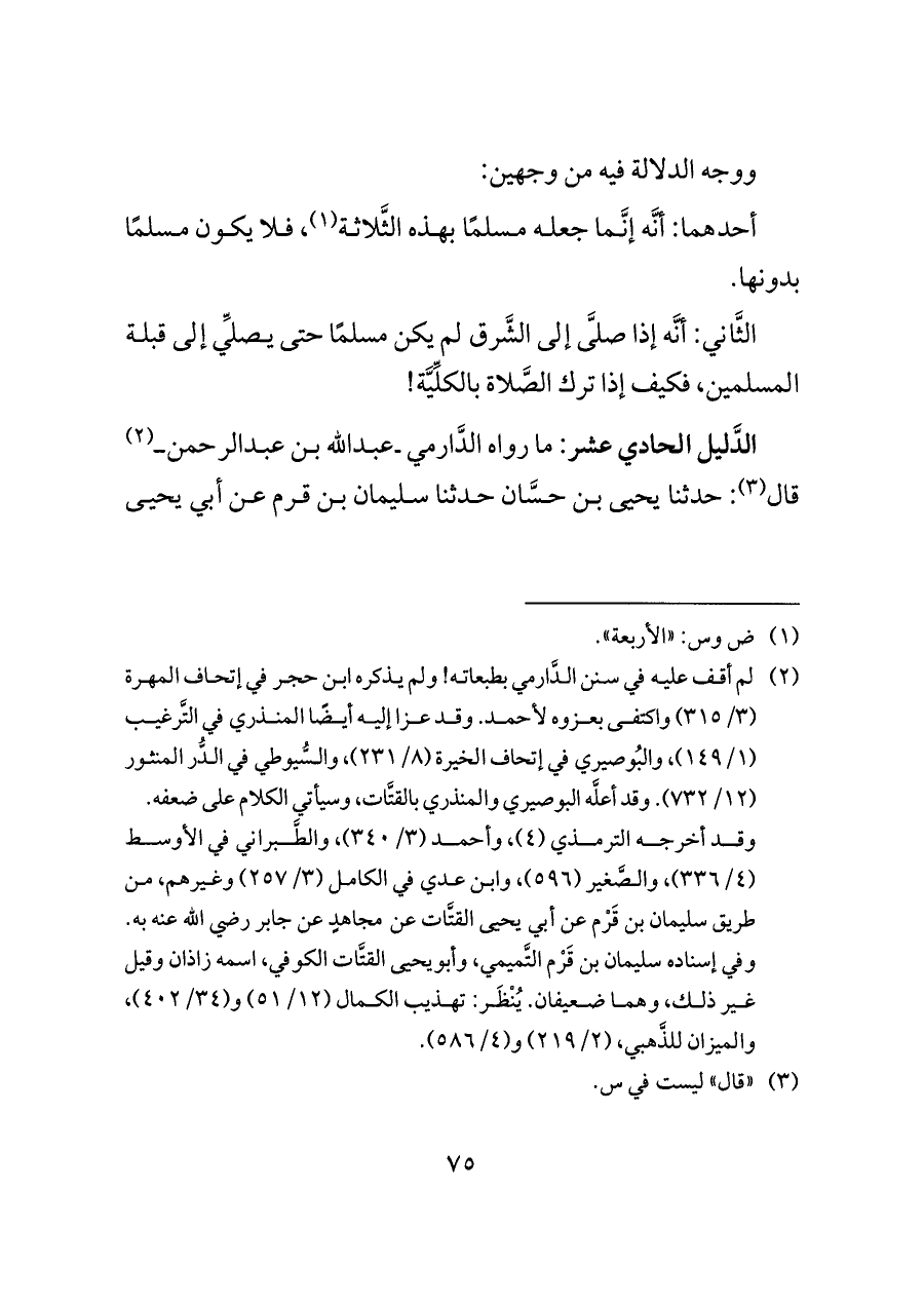 الدَّليل الحادي عشر: ما رواه الدَّارمي ـ عبدالله بن عبدالرحمن ـ (¬٢) قال (¬٣): حدثنا يحيى بن حسَّان حدثنا سليمان بن قرم عن أبي يحيى