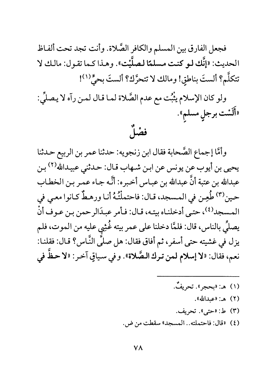 وأمَّا إجماع الصَّحابة فقال ابن زنجويه: حدثنا عمر بن الربيع حدثنا يحيى بن أيوب عن يونس عن ابن شهاب قال: حدثني عبيدالله (¬٢) بن عبدالله بن عتبة أنَّ عبدالله بن عباس أخبره: أنَّه جاء عمر بن الخطاب حين (¬٣) طُعِن في المسجد، قال: فاحتملْتُهُ أنا ورهطٌ كانوا معي في المسجد (¬٤)، حتى أدخلناه بيته، قال: فأمر عبدَالرحمن بن عوف أنْ يصلِّي بالناس، قال: فلمَّا دخلنا على عمر بيته غُشِي عليه من الموت، فلم يزل في غشيته حتى أسفر، ثم أفاق فقال: هل صلَّى النَّاس؟ قال: فقلنا: نعم، فقال: "لا إسلام لمن ترك الصَّلاة". وفي سياقٍ آخر: "لا حظَّ في