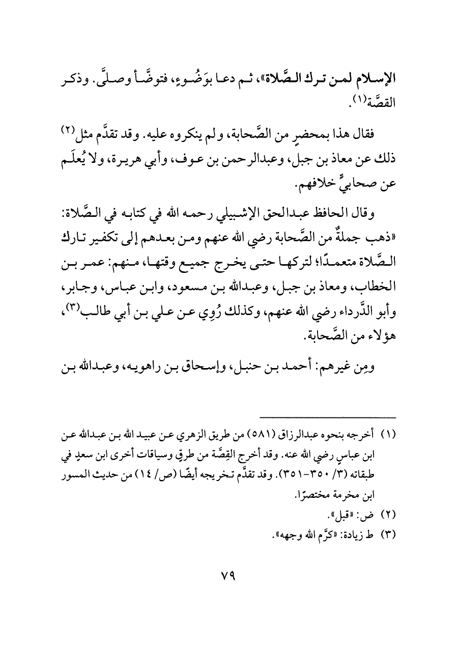 وقال الحافظ عبدالحق الإشبيلي رحمه الله في كتابه في الصَّلاة: "ذهب جملةٌ من الصَّحابة رضي الله عنهم ومن بعدهم إلى تكفير تارك الصَّلاة متعمدًا؛ لتركها حتى يخرج جميع وقتها، منهم: عمر بن الخطاب، ومعاذ بن جبل، وعبدالله بن مسعود، وابن عباس، وجابر، وأبو الدَّرداء رضي الله عنهم، وكذلك رُوِي عن علي بن أبي طالب (¬٣)، هؤلاء من الصَّحابة.