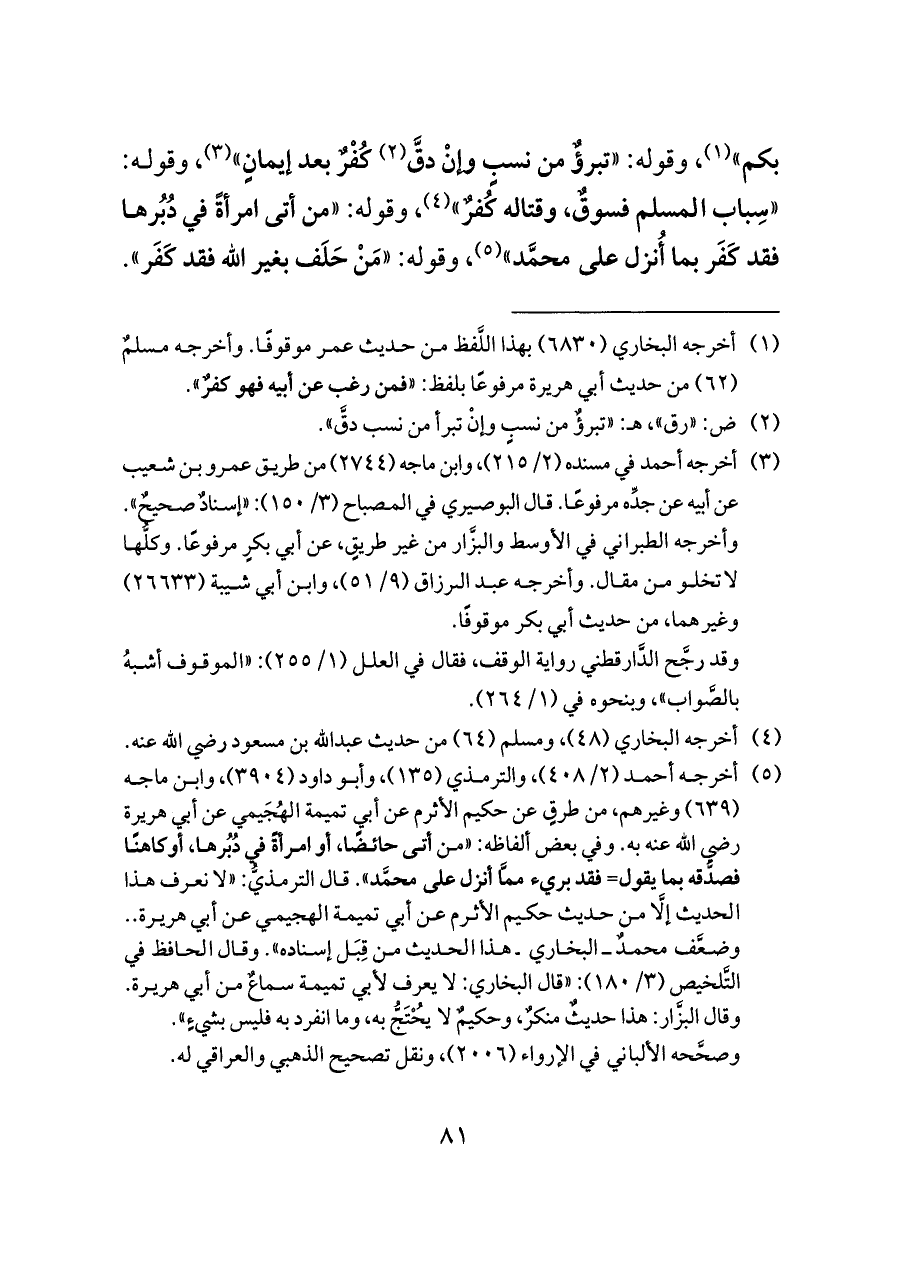 بكم" (¬١)، وقوله: "تبرؤٌ من نسبٍ وإنْ دقَّ (¬٢) كُفْرٌ بعد إيمانٍ" (¬٣)، وقوله: "سِباب المسلم فسوقٌ، وقتاله كُفرٌ" (¬٤)، وقوله: "من أتى امرأةً في دُبُرها فقد كَفَر بما أُنزل على محمَّد" (¬٥)،