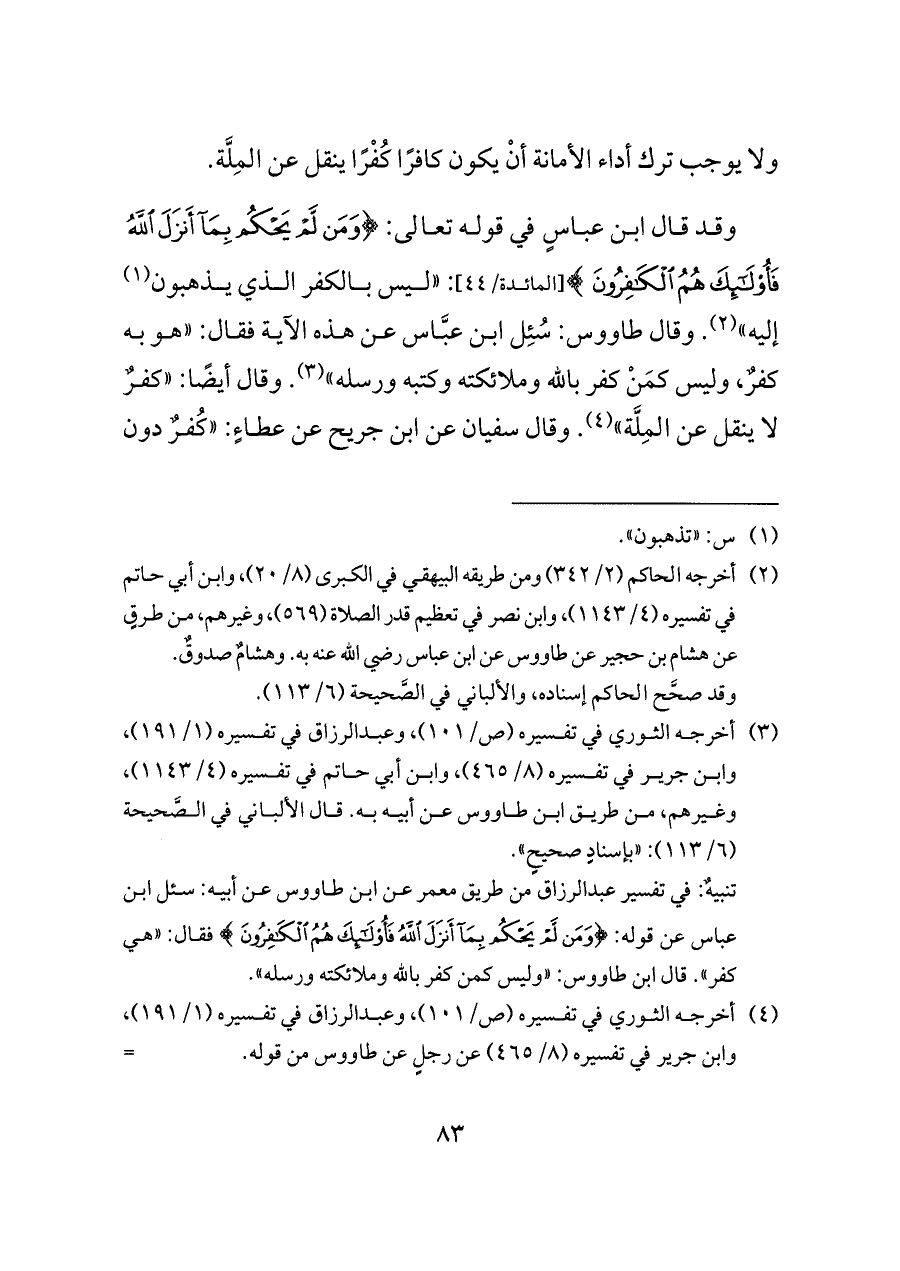 تنبيهٌ: في تفسير عبدالرزاق من طريق معمر عن ابن طاووس عن أبيه: سئل ابن عباس عن قوله: {وَمَنْ لَمْ يَحْكُمْ بِمَا أَنْزَلَ اللَّهُ فَأُولَئِكَ هُمُ الْكَافِرُونَ} فقال: "هي كفر". قال ابن طاووس: "وليس كمن كفر بالله وملائكته ورسله".