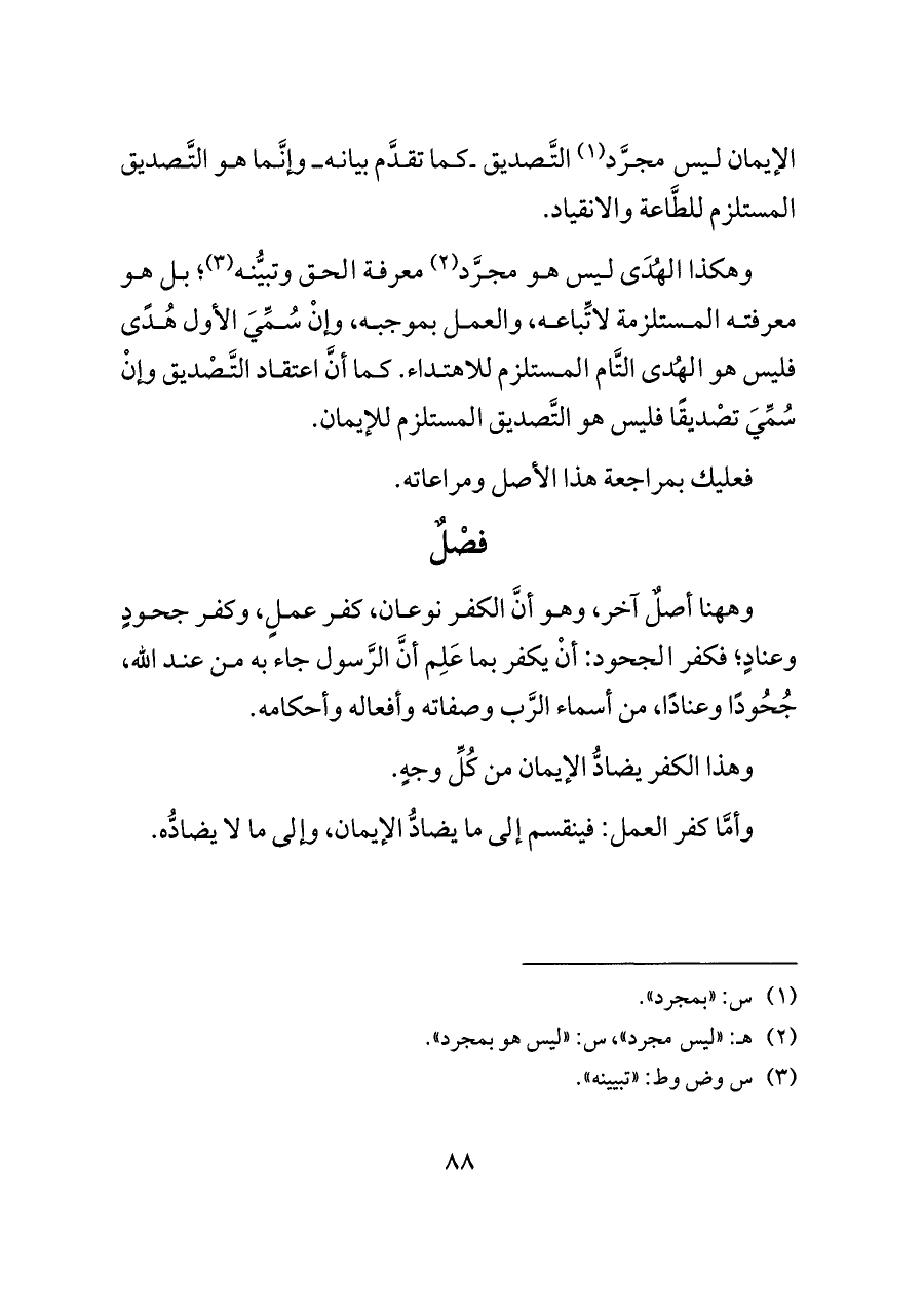 وهكذا الهُدَى ليس هو مجرَّد (¬٢) معرفة الحق وتبيُّنه (¬٣)؛ بل هو معرفته المستلزمة لاتِّباعه، والعمل بموجبه، وإنْ سُمِّيَ الأول هُدًى فليس هو الهُدى التَّام المستلزم للاهتداء. كما أنَّ اعتقاد التَّصْديق وإنْ سُمِّيَ تصْديقًا فليس هو التَّصديق المستلزم للإيمان.