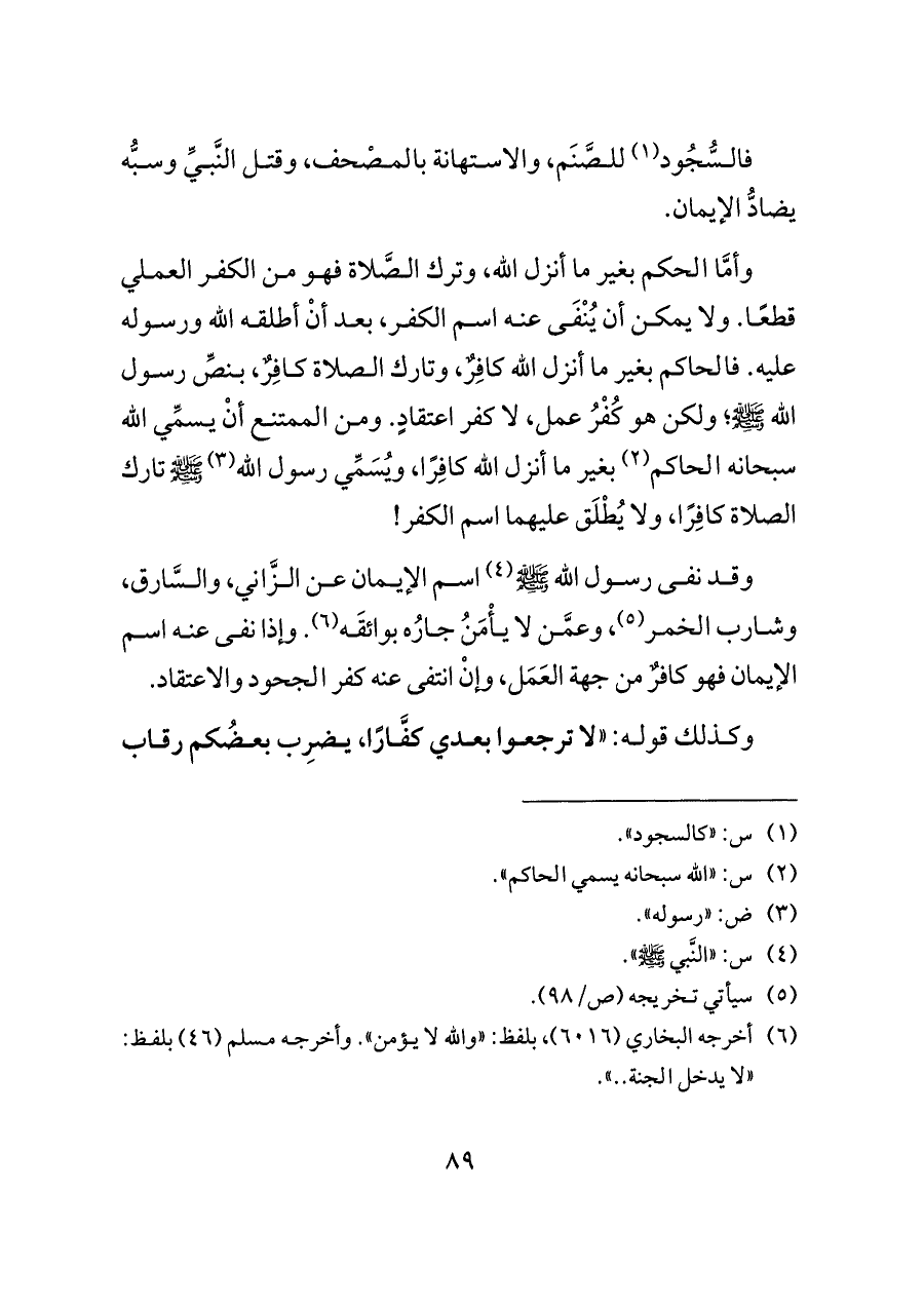 وأمَّا الحكم بغير ما أنزل الله، وترك الصَّلاة فهو من الكفر العملي قطعًا. ولا يمكن أن يُنْفَى عنه اسم الكفر، بعد أنْ أطلقه الله ورسوله عليه. فالحاكم بغير ما أنزل الله كافِرٌ، وتارك الصلاة كافِرٌ، بنصِّ رسول الله - صلى الله عليه وسلم -؛ ولكن هو كُفْرُ عمل، لا كفر اعتقادٍ. ومن الممتنع أنْ يسمِّي الله سبحانه الحاكم (¬٢) بغير ما أنزل الله كافِرًا، ويُسَمِّي رسول الله (¬٣) - صلى الله عليه وسلم - تارك الصلاة كافِرًا، ولا يُطْلَق عليهما اسم الكفر!