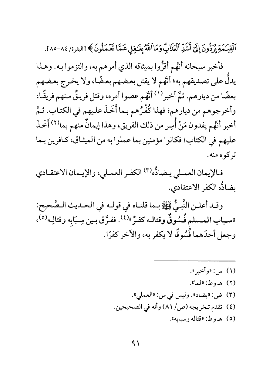 فأخبر سبحانه أنَّهم أقرُّوا بميثاقه الذي أمرهم به، والتزموا به. وهذا يدلُّ على تصديقهم به؛ أنَّهم لا يقتل بعضهم بعضًا، ولا يخرج بعضهم بعضًا من ديارهم. ثمَّ أخبر (¬١) أنَّهم عصوا أمره، وقتل فريقٌ منهم فريقًا، وأخرجوهم من ديارهم؛ فهذا كُفْرُهم بما أَخَذَ عليهم في الكتاب. ثمَّ أخبر أنَّهم يفدون مَنْ أُسِر من ذلك الفريق، وهذا إيمانٌ منهم بما (¬٢) أَخَذَ عليهم في الكتاب؛ فكانوا مؤمنين بما عملوا به من الميثاق، كافرين بما تركوه منه.
