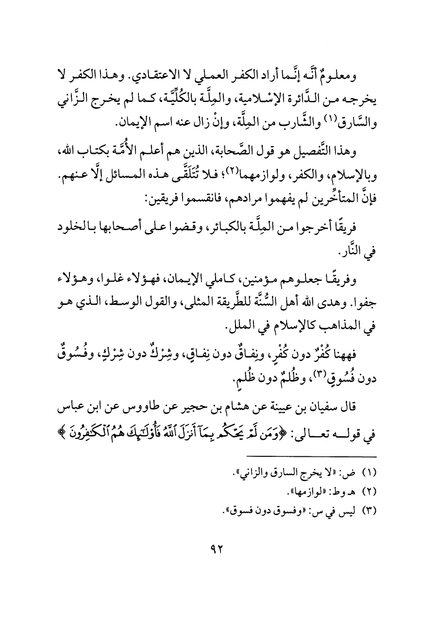 فههنا كُفْرٌ دون كُفْرٍ، ونِفاقٌ دون نِفاقٍ، وشِرْكٌ دون شِرْكٍ، وفُسُوقٌ دون فُسُوقٍ (¬٣)، وظُلمٌ دون ظُلمٍ.
