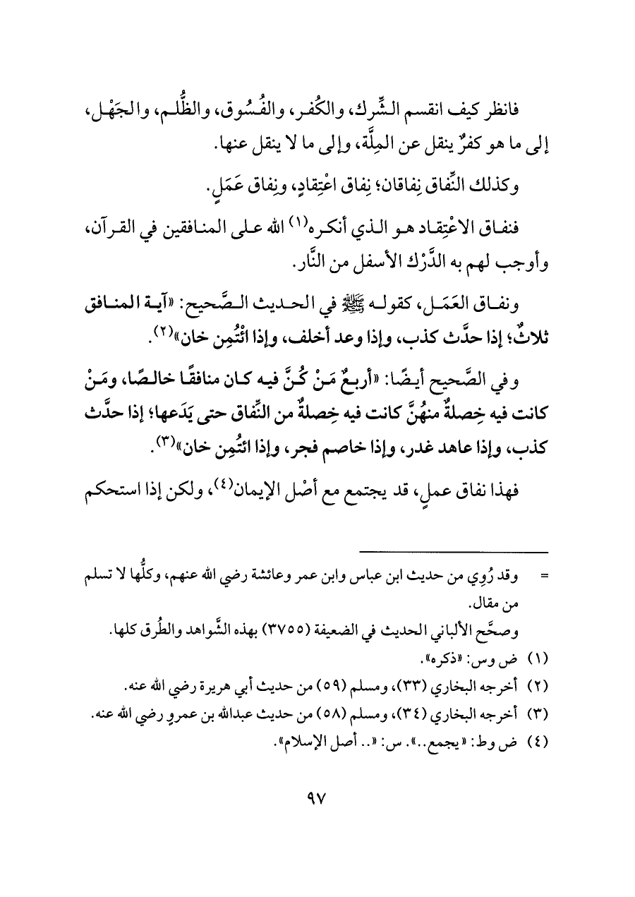 وكذلك النِّفاق نِفاقان؛ نِفاق اعْتِقادٍ، ونِفاق عَمَلٍ.