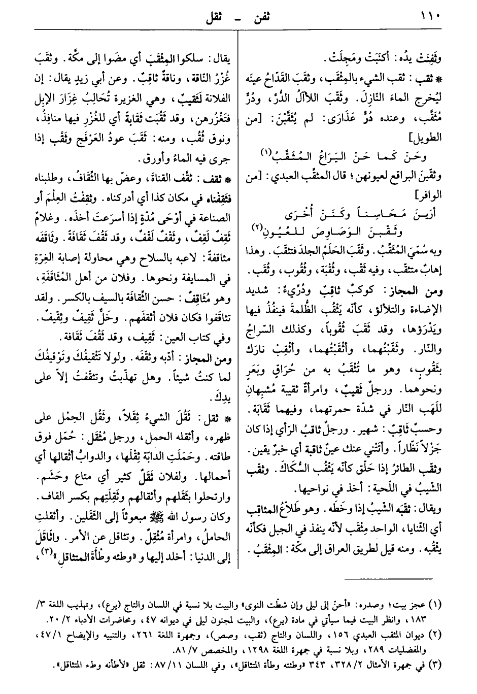 ثقف القناة، وعض بها الثقاف. وطلبناه فثقفناه في مكان كذا أي أدركناه. وثقفت العلم أو الصناعة في أوحى مدة: إذا أسرعت أخذه. وغلام ثقف لقف، وثقف لقف، وقد ثقف ثقافة. وثاقفه مثاقفة لاعبه بالسلاح وهي محاولى إصابة الغرة في المسايفة ونحوها. وفلان من أهل المثاقفة، وهو مثاقف: حسن الثقافة بالسيف بالكسر. ولقد تثاقفوا فكان فلان أثقفهم. وخل ثقيف وثقّيف. وفي كتاب العين: ثقيف، وقد ثقف ثقافة.