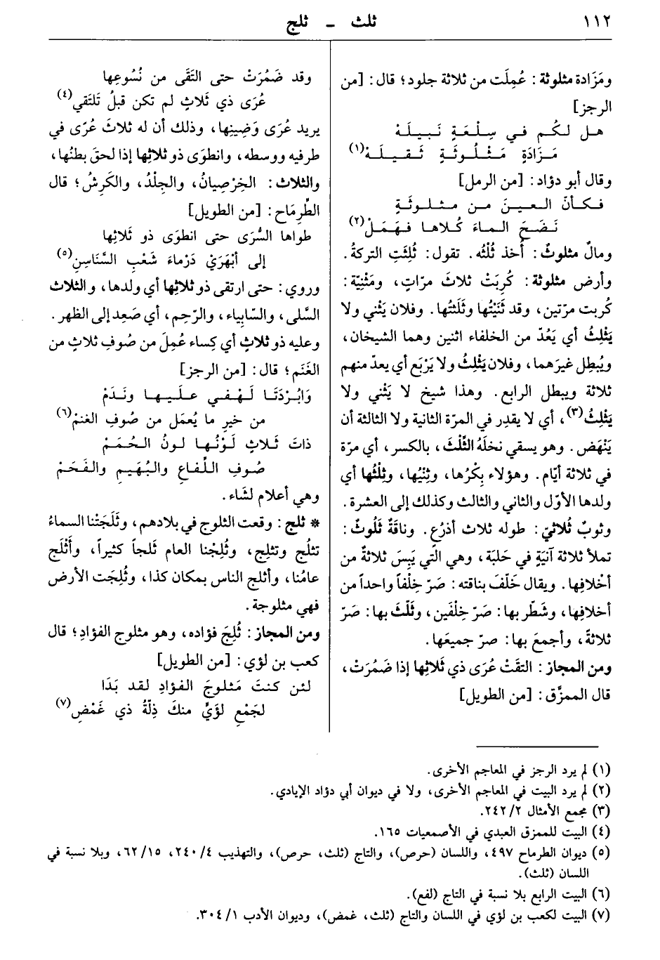 وأرض مثلوثة: كربت ثلاث مرات، ومثنية: كربت مرتين، وقد ثنيتها وثلثتها. وفلان يثني ولا يثلث أي يعد من الخلفاء اثنين وهما الشيخان، ويبطل غيرهما وفلان يثلث ولا يربع أي يعد منهم ثلاثة ويبطل الرابع. وهذا شيخ لا يثني ولا يثلث أي لا يقدر في المرة الثانية ولا الثالثة أن ينهض. وهو يسقى نخلة الثلث بالكسر أي مرة في ثلاثة أيام. وهؤلاء بكرها، وثنيها، وثلثها أي ولدها الأول والثاني والثالث وكذلك إلى العشرة. وثوب ثلاثي: طوله ثلاث أذرع. وناقة ثلوث: تملأ ثلاثة آنية في حلبة، وهي التي يبس ثلاثة من أخلافها. ويقال: خلف بناقته: صر خلفاً واحداً من أخلافها، وشطر بها: صر خلفين، وثلث بها: صر ثلاثة، وأجمع بها: صر جمعها.
