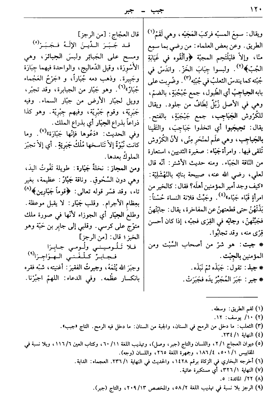 ويقال: سمع المسبة، فركب المجبة؛ وهي لقم الطريق. وعن بعض العلماء: من رضي بما سمع منا، وإلا فليلتحم المجبة " وألقوه في غيابة الجب ". ولبسوا جباب الخز. واندس في جبته كما يندس الثعلب في جبته. وضربت على بابه الجباجب أي الطبول، جمع جبجبة بالضم وهي في الأصل زبل لطاف من جلود. ويقال للكروش الجباجب، جمع جبجبة بالفتح. يقال: تجبجبوا أي اتخذوا جباجب، والتقينا بالجباجب، وهي علم لمنحر منًى: لأن الكروش تلقى فيها. وارمأة جباء: صغيرة الثديين، استعارة من الناقة الجباء. ومنه حديث الأشتر: أنه قال لعلي رضي الله عنه صبيحة بنائه بالنهشلية " كيف وجد أمير المؤمنين أهله فقال كالخير من امرأة قباء جباء ". وجبت فلانة النساء حسناً: بذتهن حتى قطعتهن عن المفاخرة، يقال جابتهن فجبتهن، وجابه في القرى فجبه، إذا كان أحسن قرىً منه، وقد تجابوا.