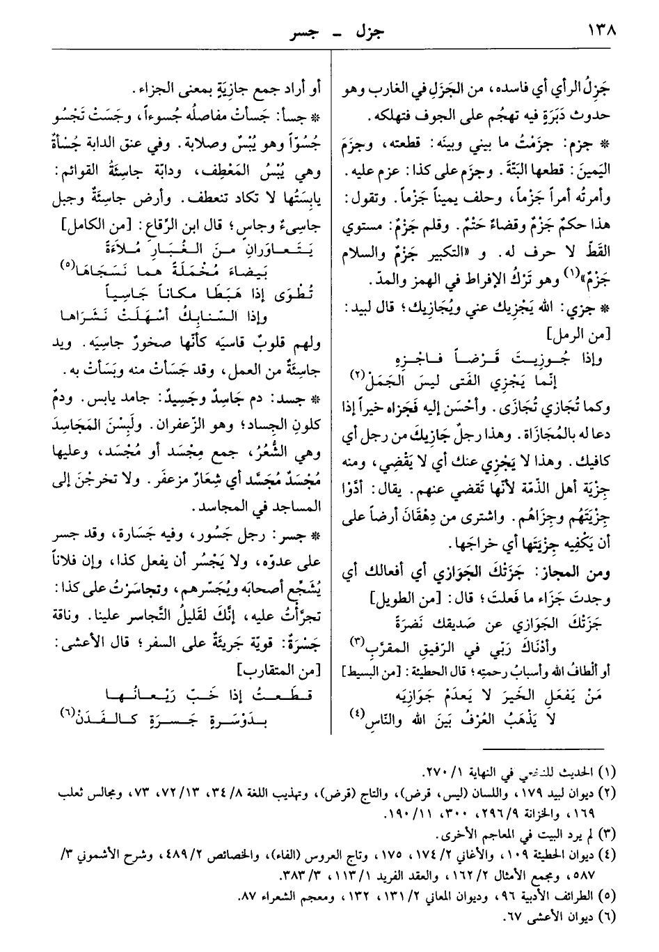 رجل جسور، وفيه جسارة، وقد جسر على عدوه، ولا يجسر أن يفعل كذا، وإن فلاناً يشجع أصحابه ويجسرهم، وتجاسرت على كذا: تجرأت عليه، وإنك لقيل التجاسر علينا. وناقة جسرة: قوية جريئة على السفر.