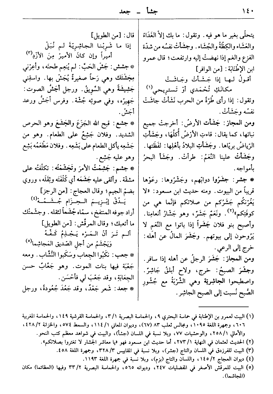 جشروا دوابهم، وجشروها: رعوها قريباً من البيوت. ومنه حديث ابن مسعود " لا يغرنكم جشركم من صلاتكم فإنّما هي من كوفتكم " ونعم جشر، وهو جشار أنعامنا. وأصبح بنو فلان جشراً إذا باتوا مع النعم لا يروحون إلى بيوتهم. وجشر المال عن أهله: خرج إلى الرعي.