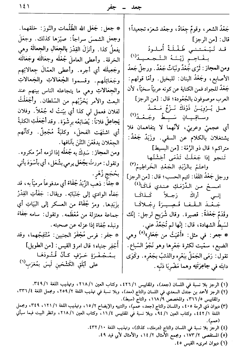 جعل الله الظلمات والنور: خلقهما. وجعل الشمس سراجاً: صيرها كذلك. وجعل يفعل كذا. وأنزل القدر بالجعال والجعالة وهي الخرقة. وأعطى العامل جعله وجعالته وجعيلته أي أجره. وأعطى العمال جعالاتهم وجعائلهم. وقسموا الجعالات وهي ما يتجاعله الناس بينهم عند البعث والأمر، يحزبهم من السلطان. وأجعلت لفلان فعمل لي كذا أي بينت له جعلاً. وفلان يجاعل فلاناً: يصانعه برشوة. وقد أجعلت الكلبة أي اشتهت الفحل، وكلبة مجعل. وكأنهم الجعلان يدفعن النتن بآنافها.